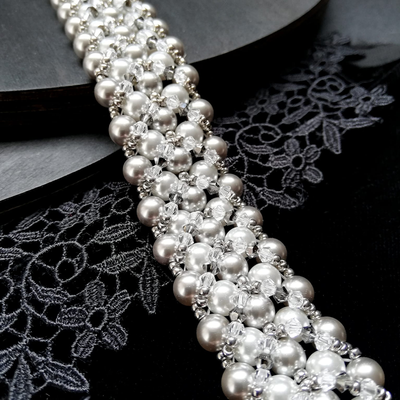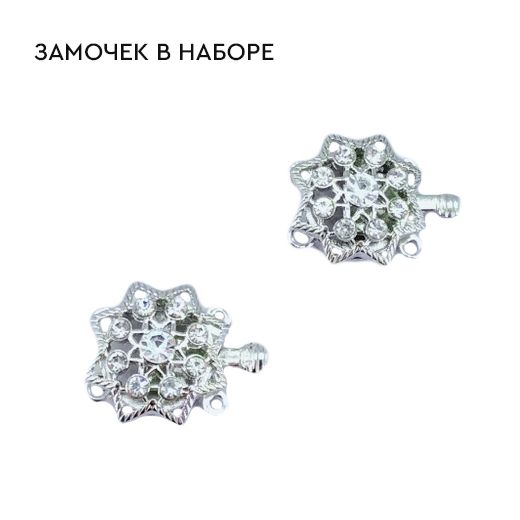 В набор входит: кристальный жемчуг в цвете Moonlight и Light Grey, биконусы Crystal и Light Chrome, бисер Miyuki Palladium Plated, замочек для браслета, а также нить и иглы.