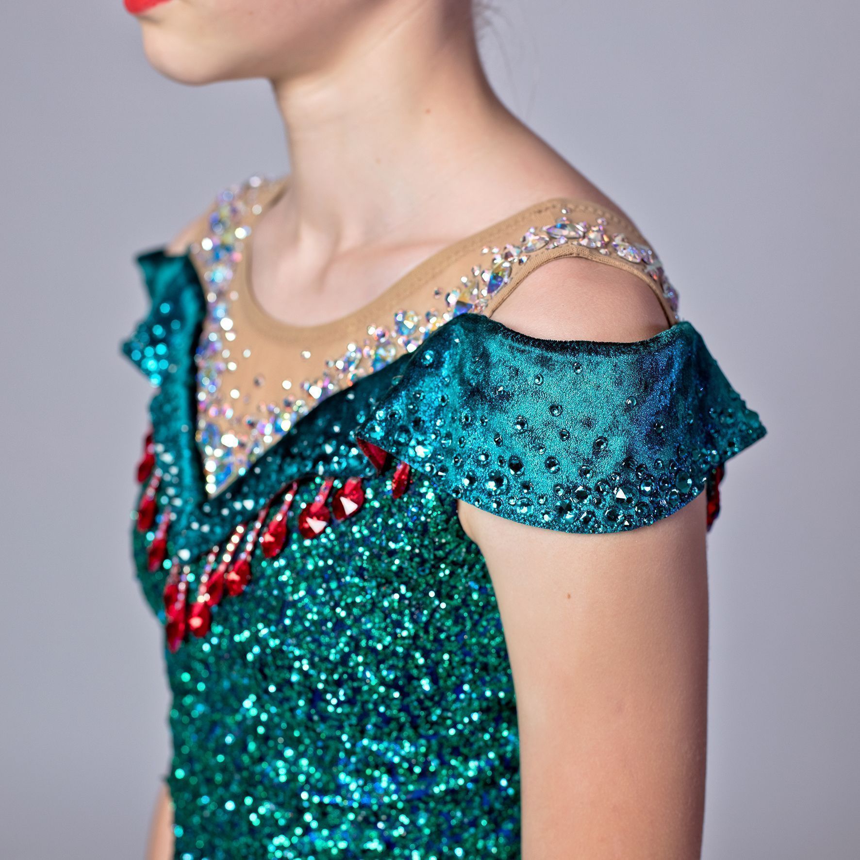 Постепенно стразы Swarovski начинают массово использовать для декора в различных сферах. И гимнастика не исключение. В купальнике, украшенном кристаллами Swarovski, каждая гимнастка может почувствовать себя королевской особой на торжественном мероприятии. И мой купальник не исключение (пусть и не скромно звучит). В данном дизайне хотелось показать чистый и ярчайший блеск кристаллов Cobalt Shimmer и Blue Zircon Shimmer, дополнительно подчеркнутый глиттерной тканью. А красные акценты из камней Light Siam Shimmer добавили образу завершенности. Простой и лаконичный дизайн подчеркивает изящество гимнастки и ее линий, напоминает вечернее платье и не отвлекает внимание от самой гимнастки. А блеск просто завораживает зрителей.