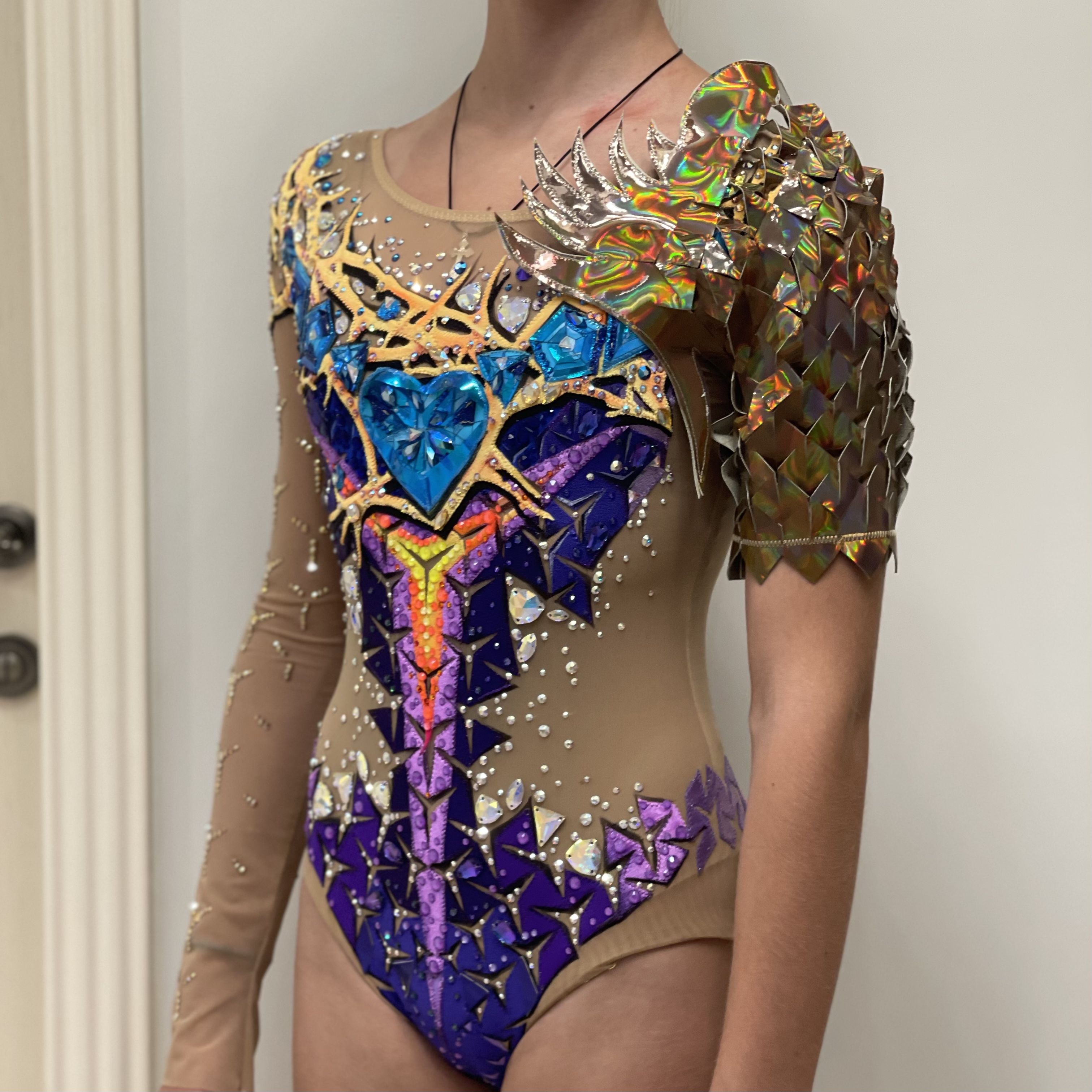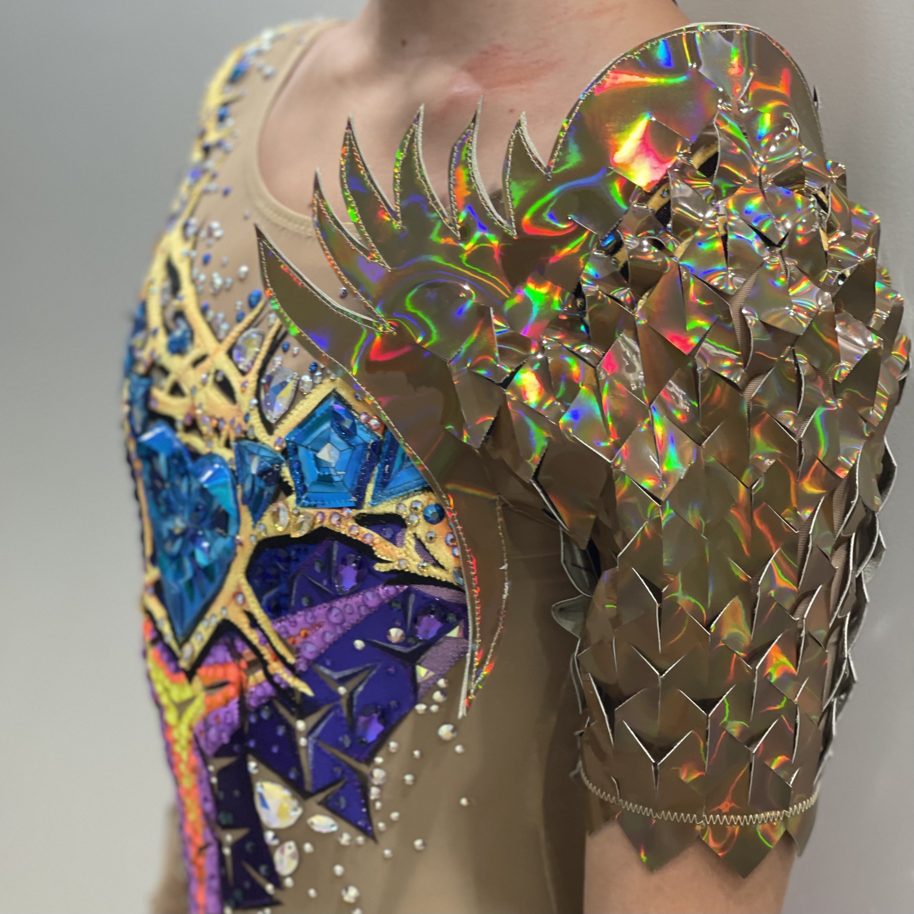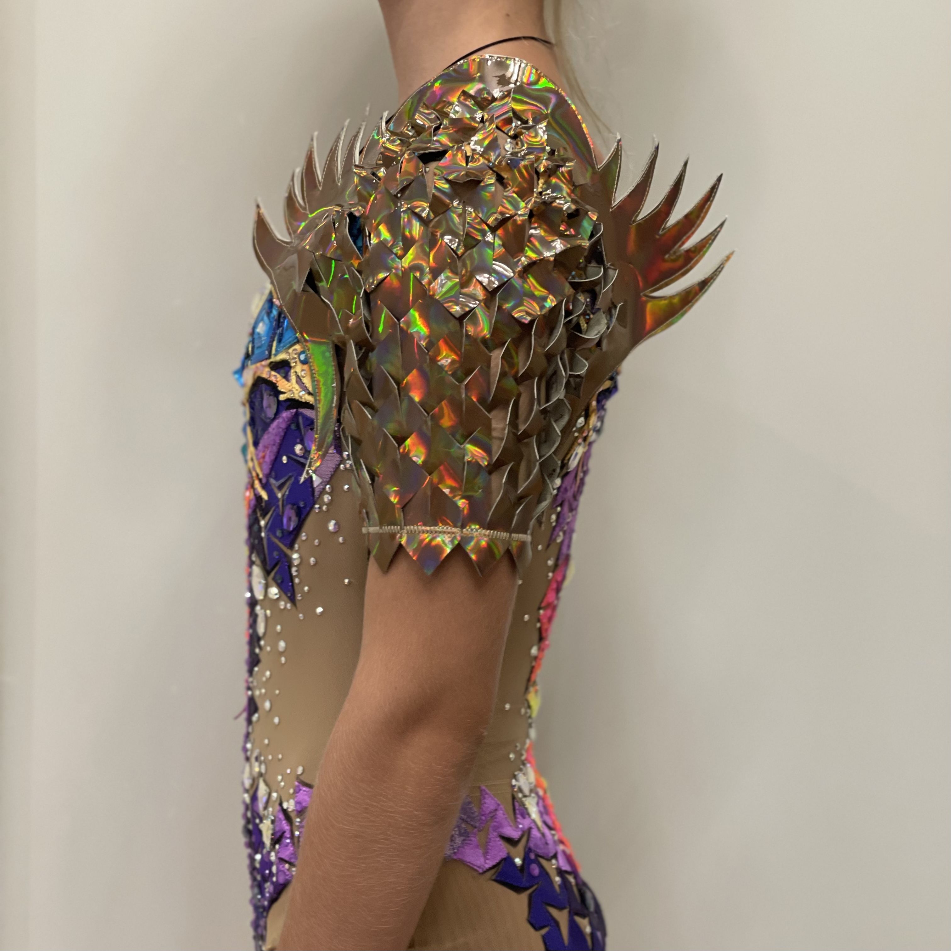 В своей работе я использовала винил взглянув на него с другого ракурса, как на отдельный элемент, придав ему способность растягиваться, повторяя форму тела, создав оригинальную текстуру поверхности. Рукав из винила подчёркивает образ своей остротой и колкостью формы, но он также как и кристаллы переливается и привлекает взгляд.