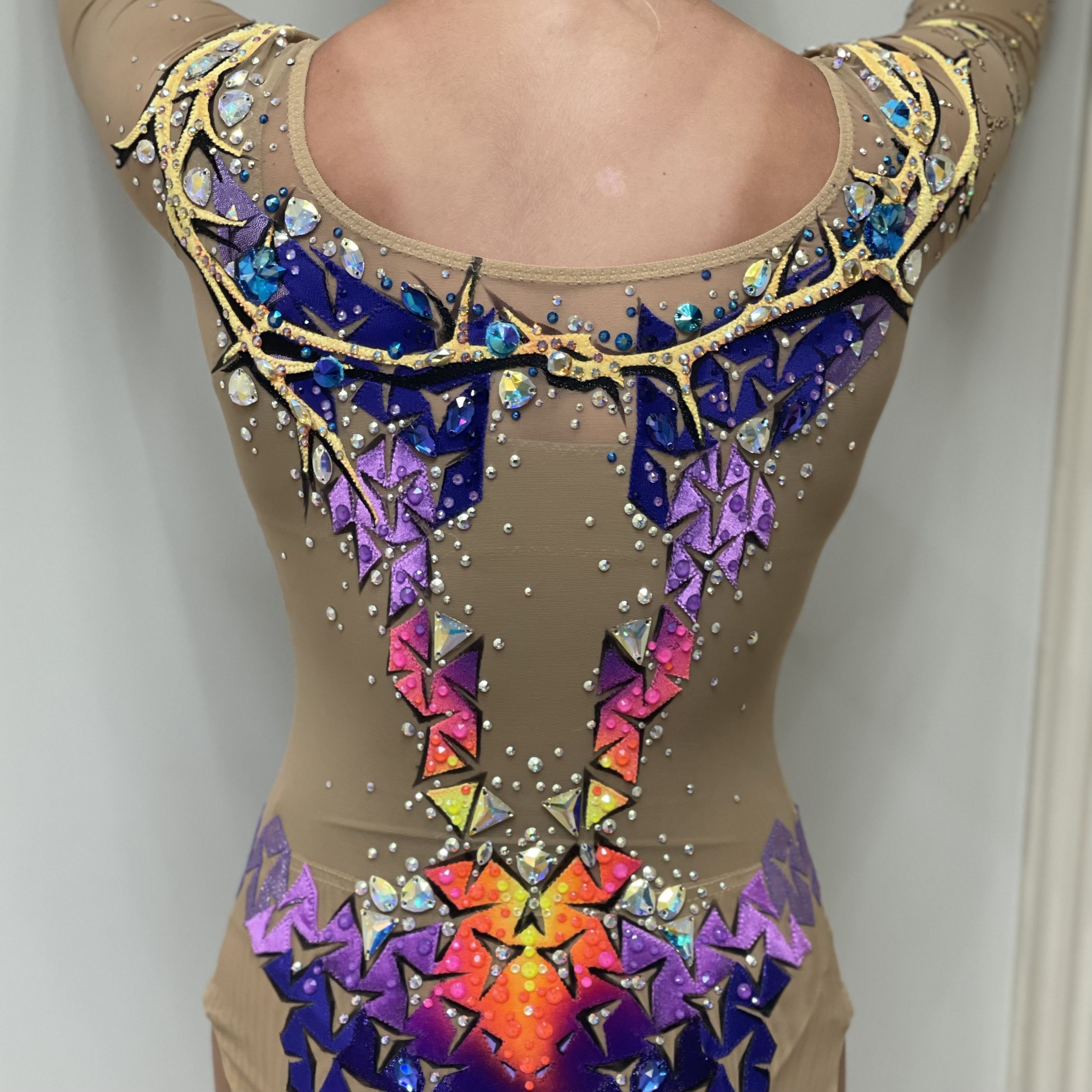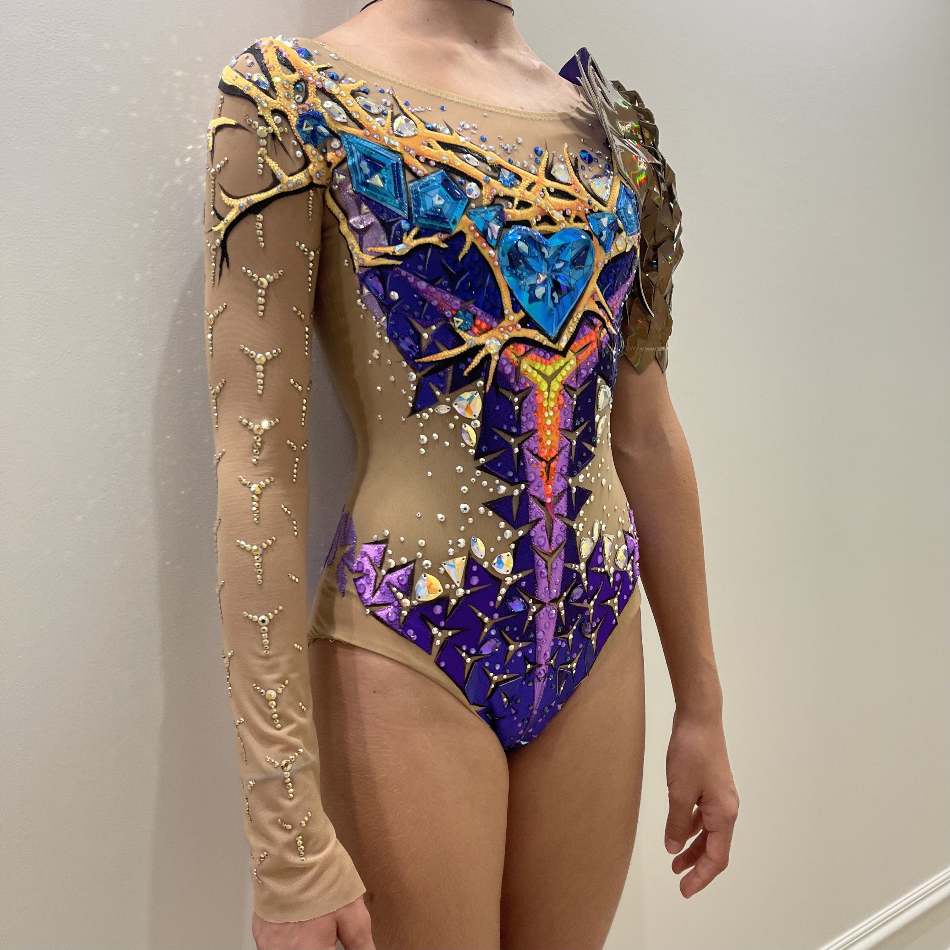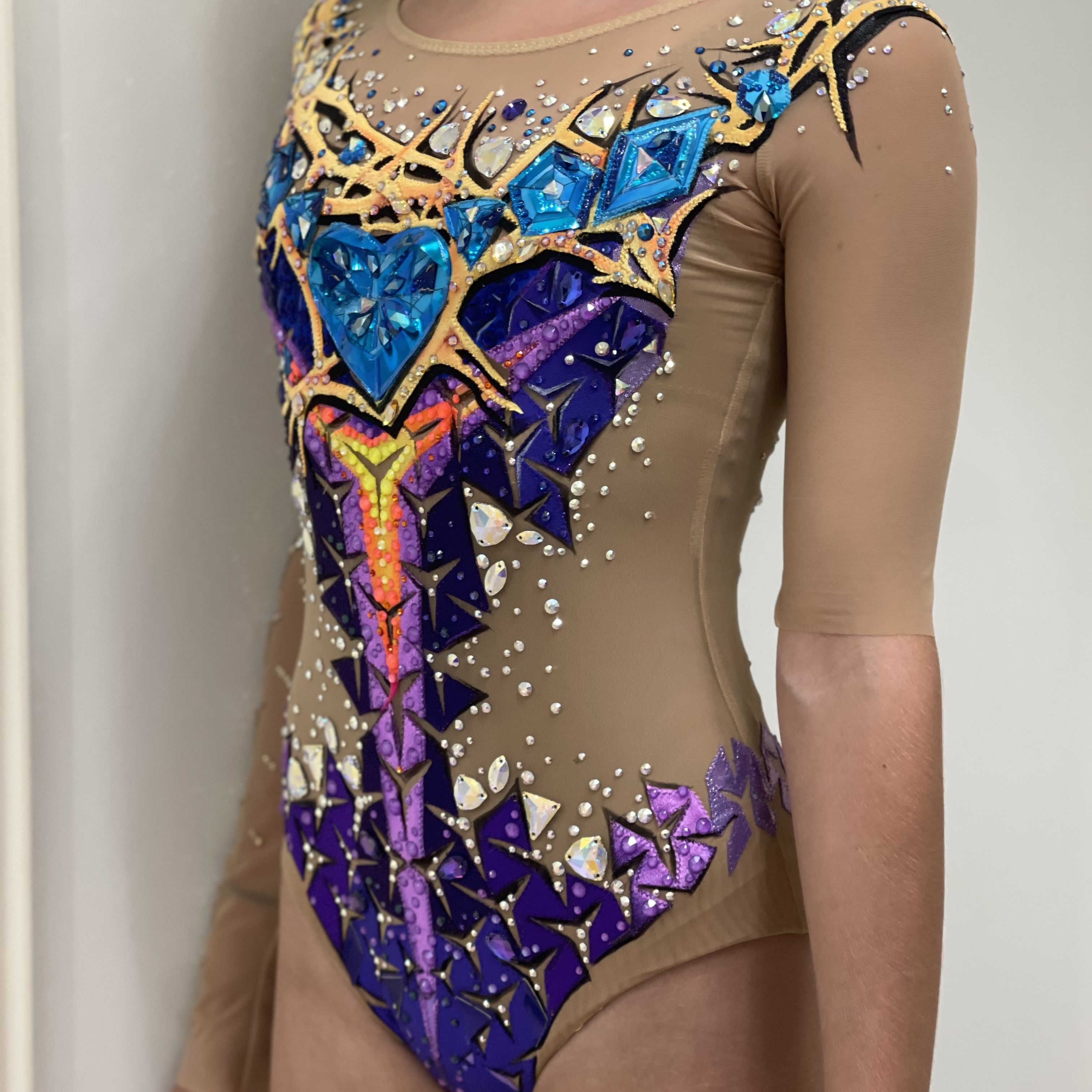В своей работе я использовала винил взглянув на него с другого ракурса, как на отдельный элемент, придав ему способность растягиваться, повторяя форму тела, создав оригинальную текстуру поверхности. Рукав из винила подчёркивает образ своей остротой и колкостью формы, но он также как и кристаллы переливается и привлекает взгляд.