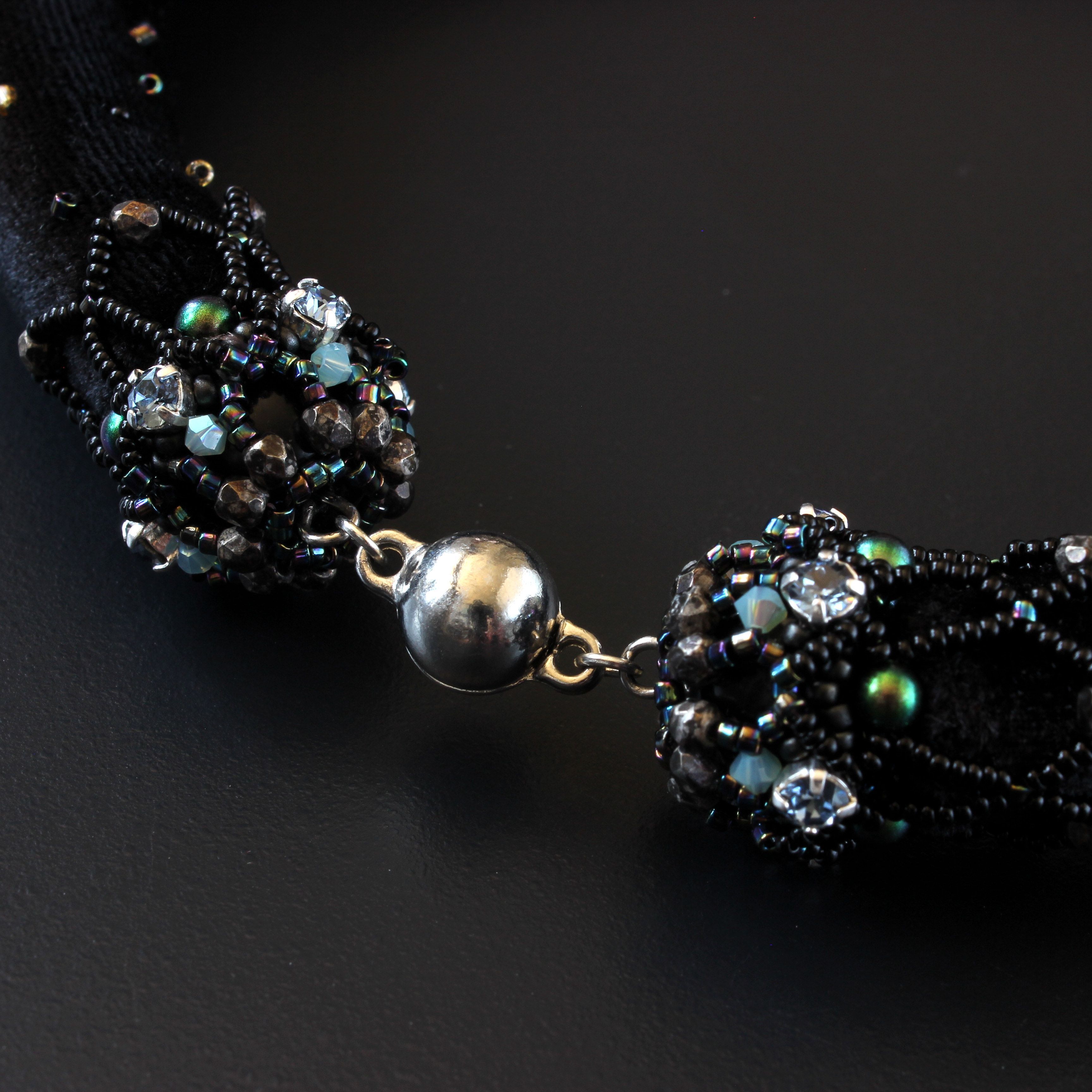 Чёрный бархат — прекрасный фон для блеска кристаллов, на нем они сияют особенно ярко. Мне захотелось создать объёмное, насыщенное блеском украшение, при этом лёгкое, уютное и одновременно благородное. Так вышло украшение в виде мягкого бархатного жгута, расшитого узором из моих любимый кристаллов.