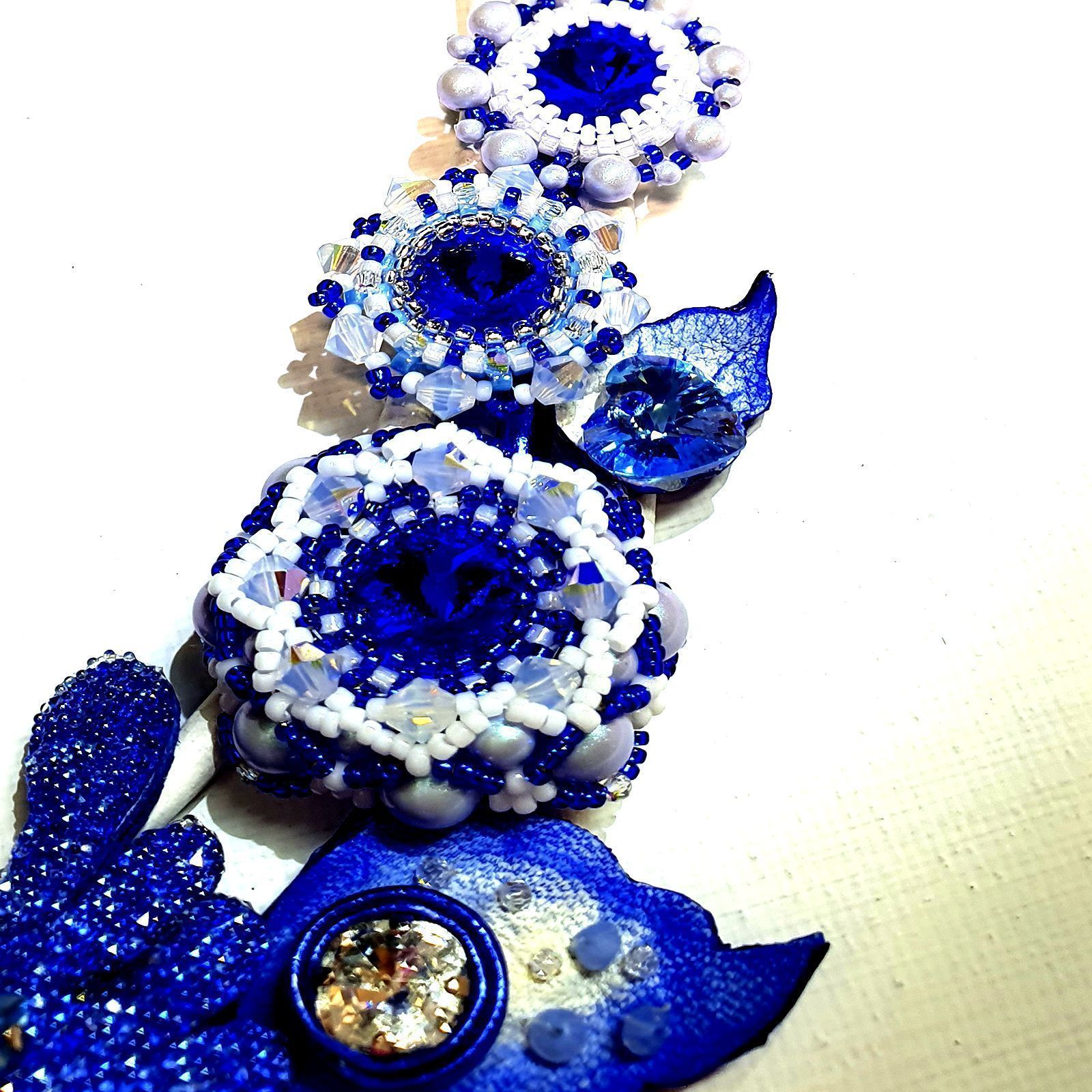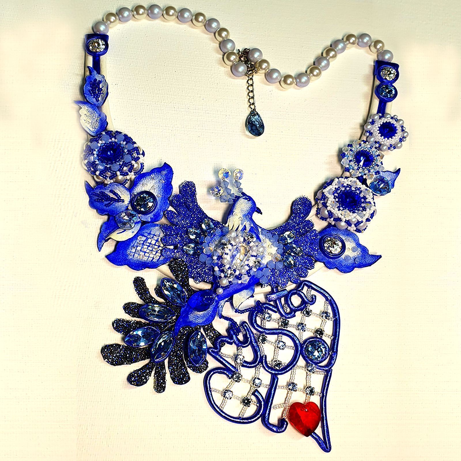 Услышав впервые название конкурса «Crystal Love», мне сразу вспомнилось выражение «Из России с любовью» - так и зародилось название колье. Захотелось создать украшение с самобытным характером, присущим культуре нашей страны. Рассмотрев конкурсные кристаллы, я определилась с цветовой гаммой. Органичная комбинация белого и синего цветов кристаллов, хрустального жемчуга и натуральной кожи, характерные для русской народной росписи «Гжель». Сказочная птица, цветы, листочки соединились в одно целое. Роспись по коже и блеск кристаллов эффектов Ignite, Shimmer, Opal дополняют друг друга. В центре колье сверкающая птица, держащая буквенное сердце с красным огоньком – любви к кристаллам Сваровски.