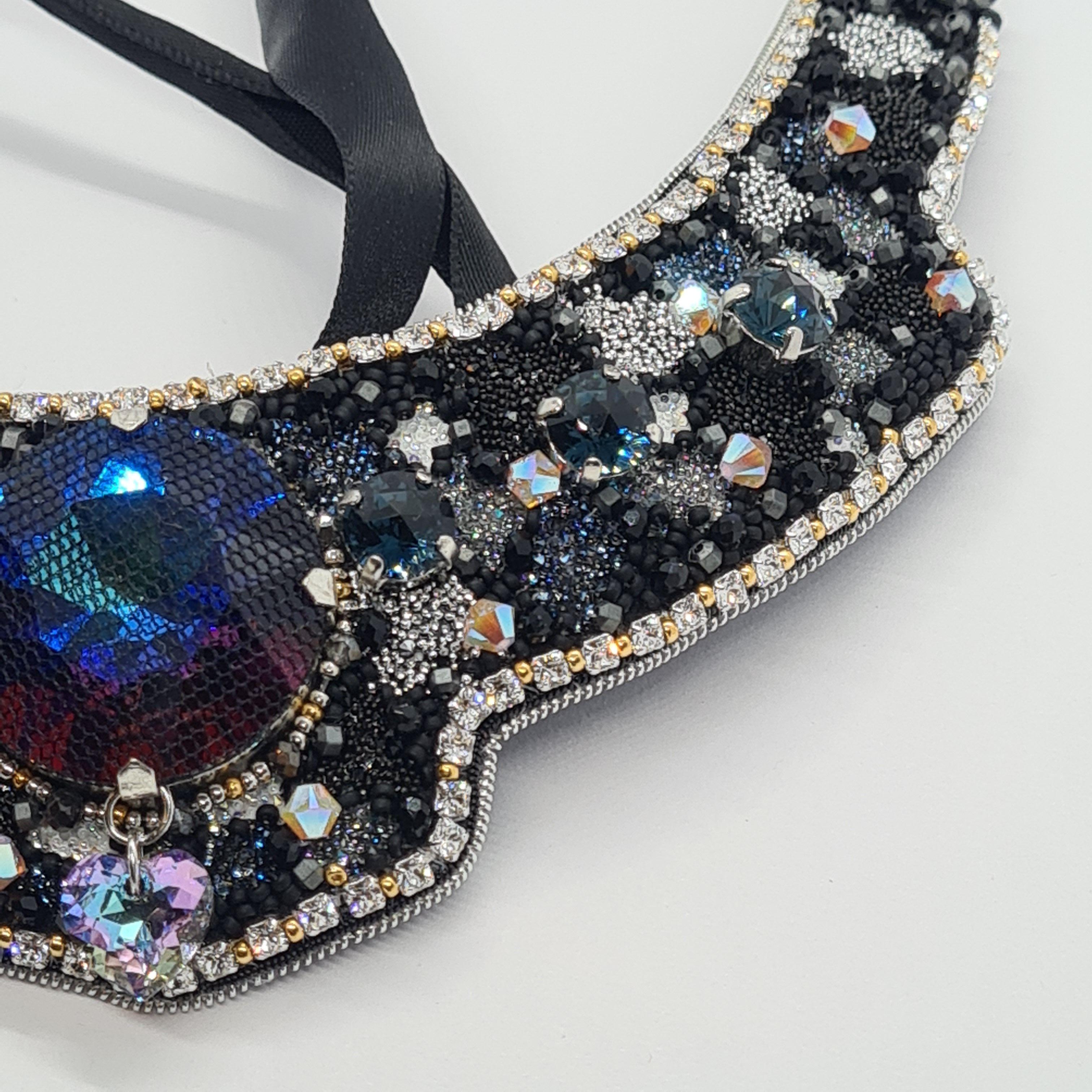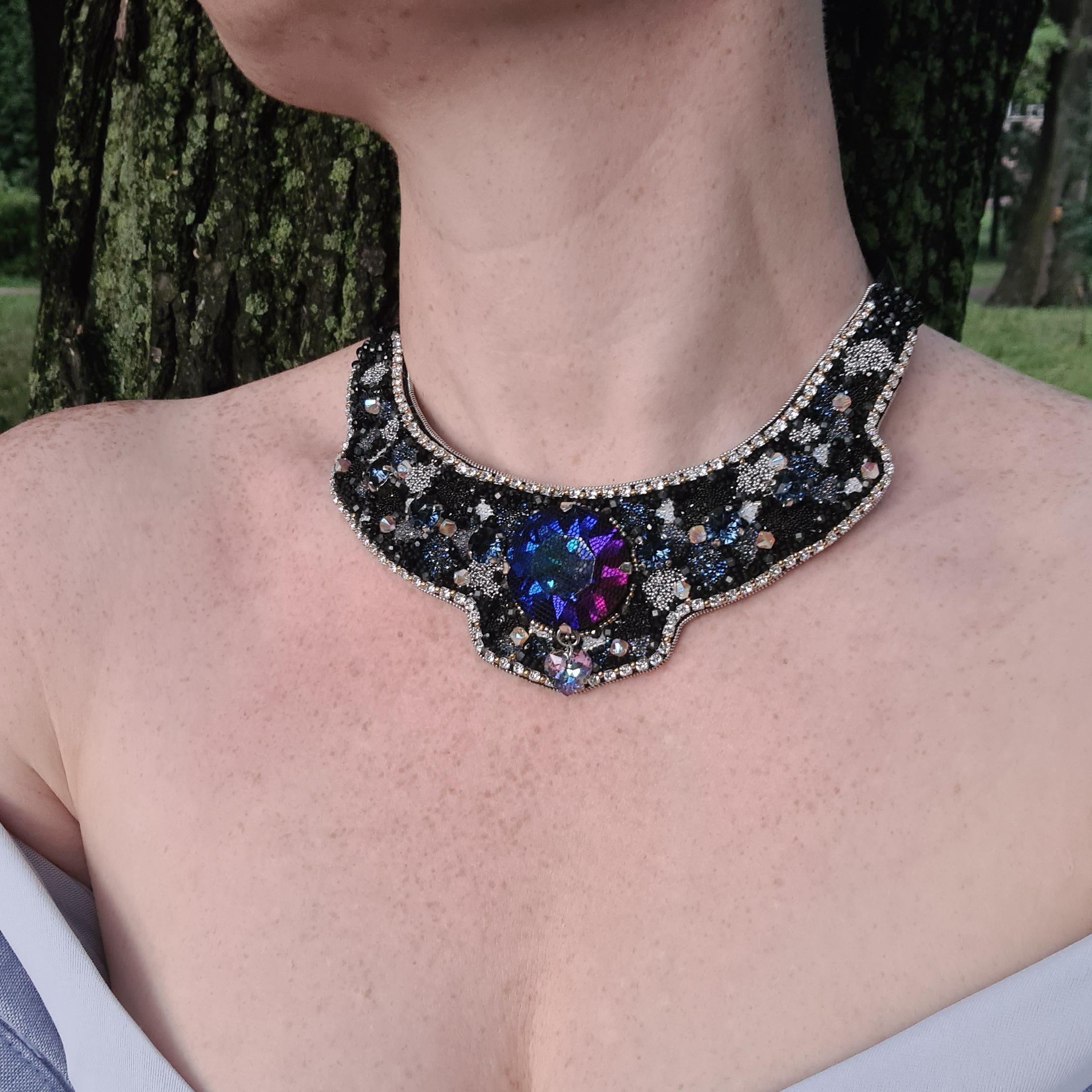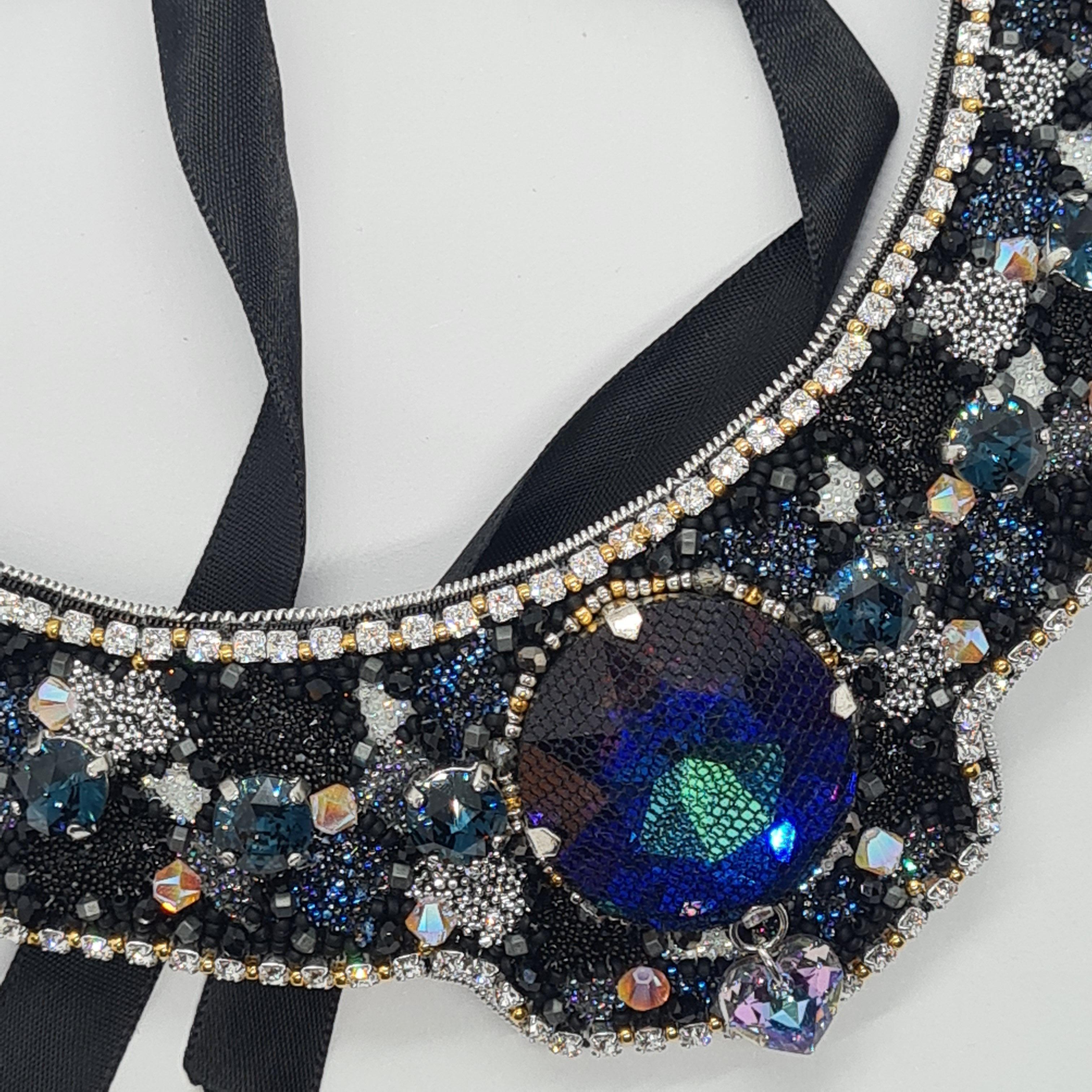 Из меня не получается хороший писатель и не очень умею презентовать свои украшения и аксессуары, но главное не то, как я умею писать, а то, что я вложила в это колье. Это мой первый опыт подобного изделия, мое первое колье. В нем собрано все, что я так люблю у Сваровски: критастальная ткань (я обожаю с ней работать, одно ее магическое мерцание и блеск сводит с ума), 1201 (мне кажется он прекрасен в любом цвете, да него можно просто любоваться), а цвет Montana у кристаллов волшебный. Как в моем изделии раскрыта тема конкурса? Для меня это любовь к своему творчеству, любовь к Сваровски и любовь к блеску.