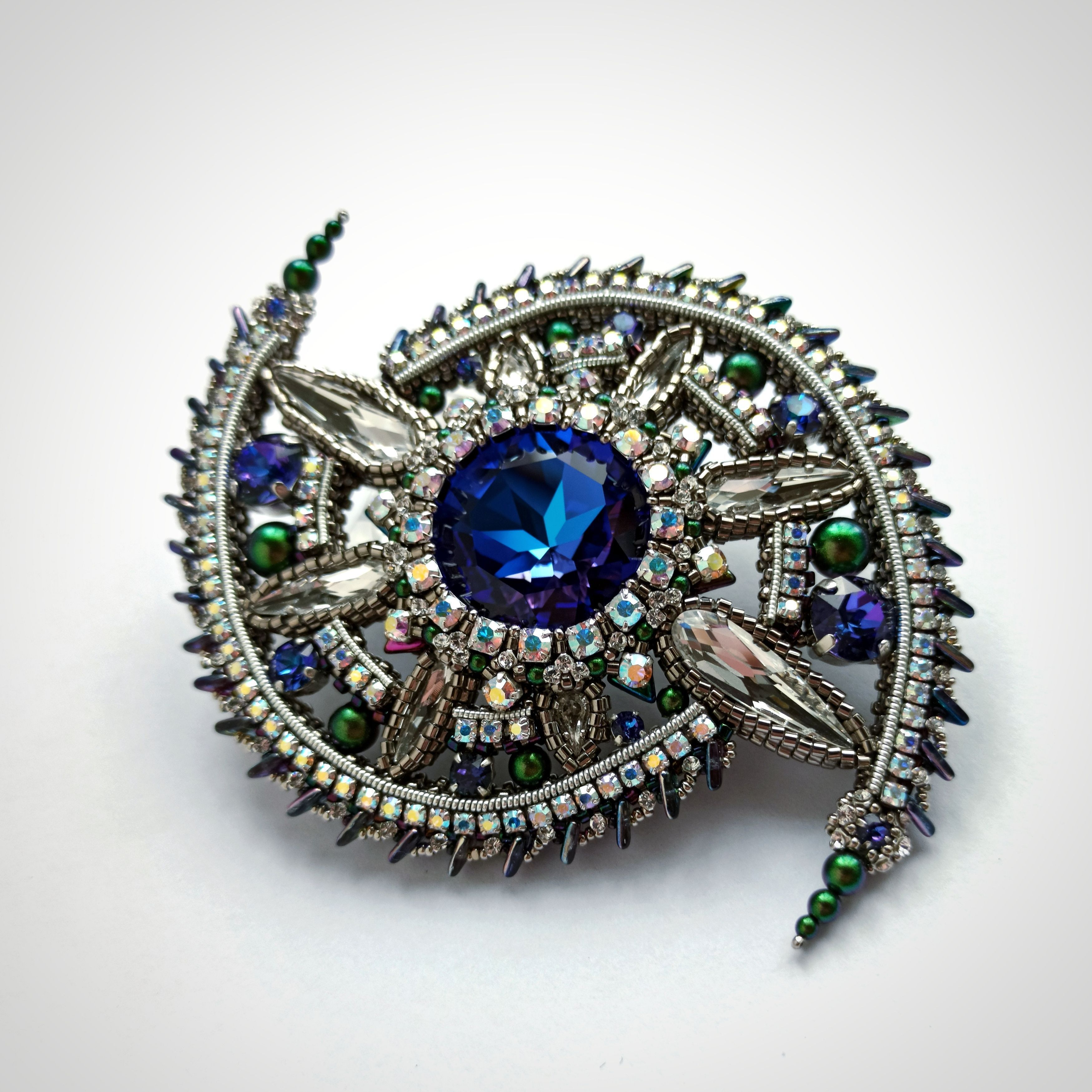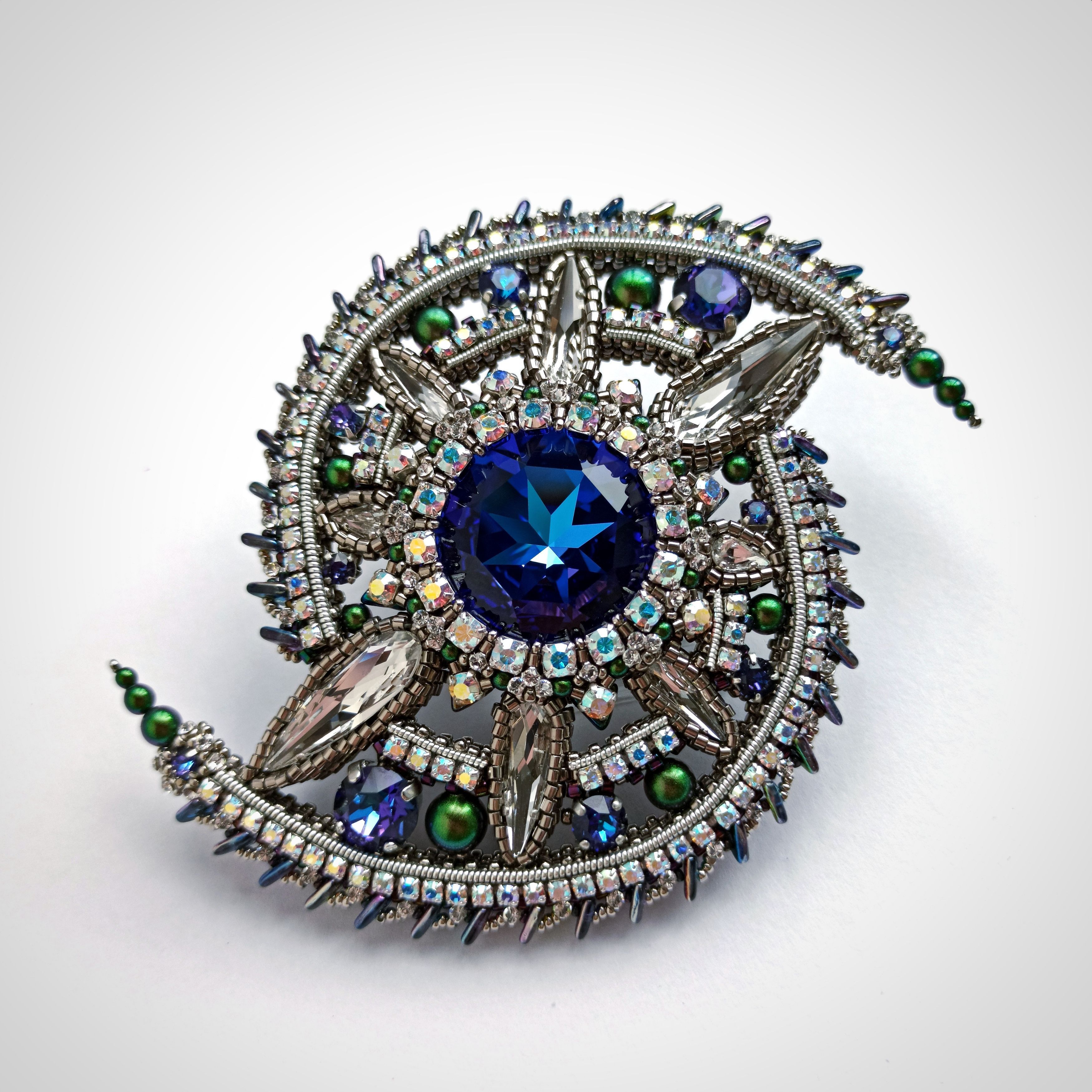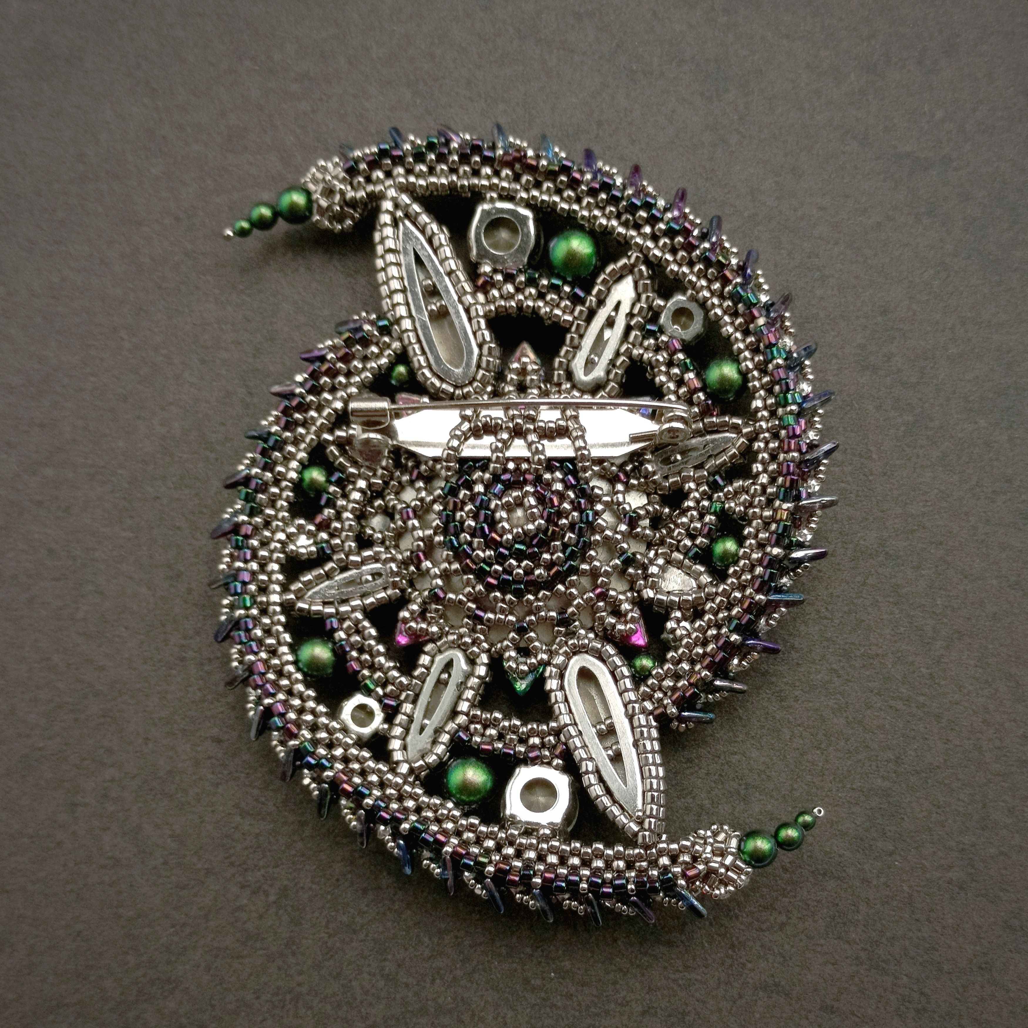 Брошь выполнена в различных техниках бисероплетения и при своей ювелирной проработке и огромном количестве деталей имеет размер около 8 см.