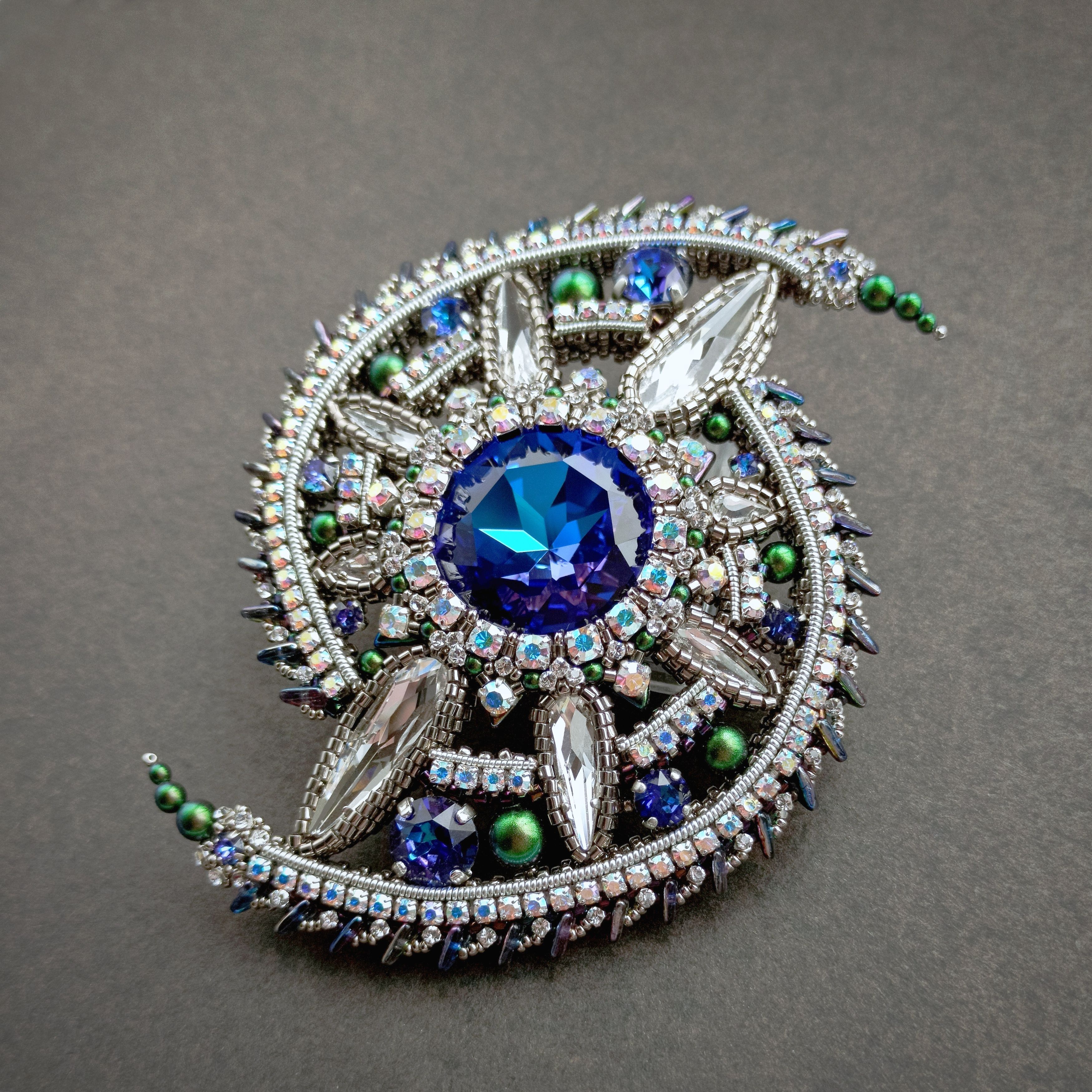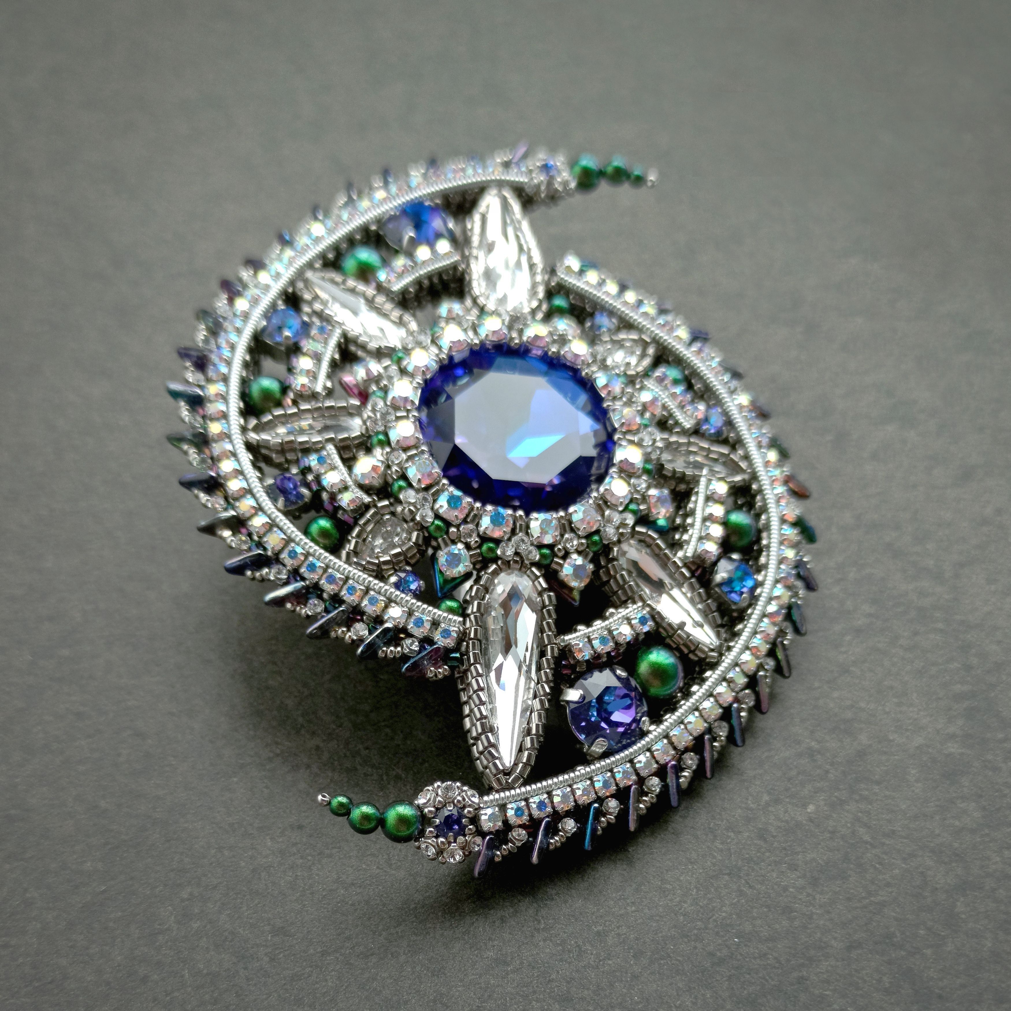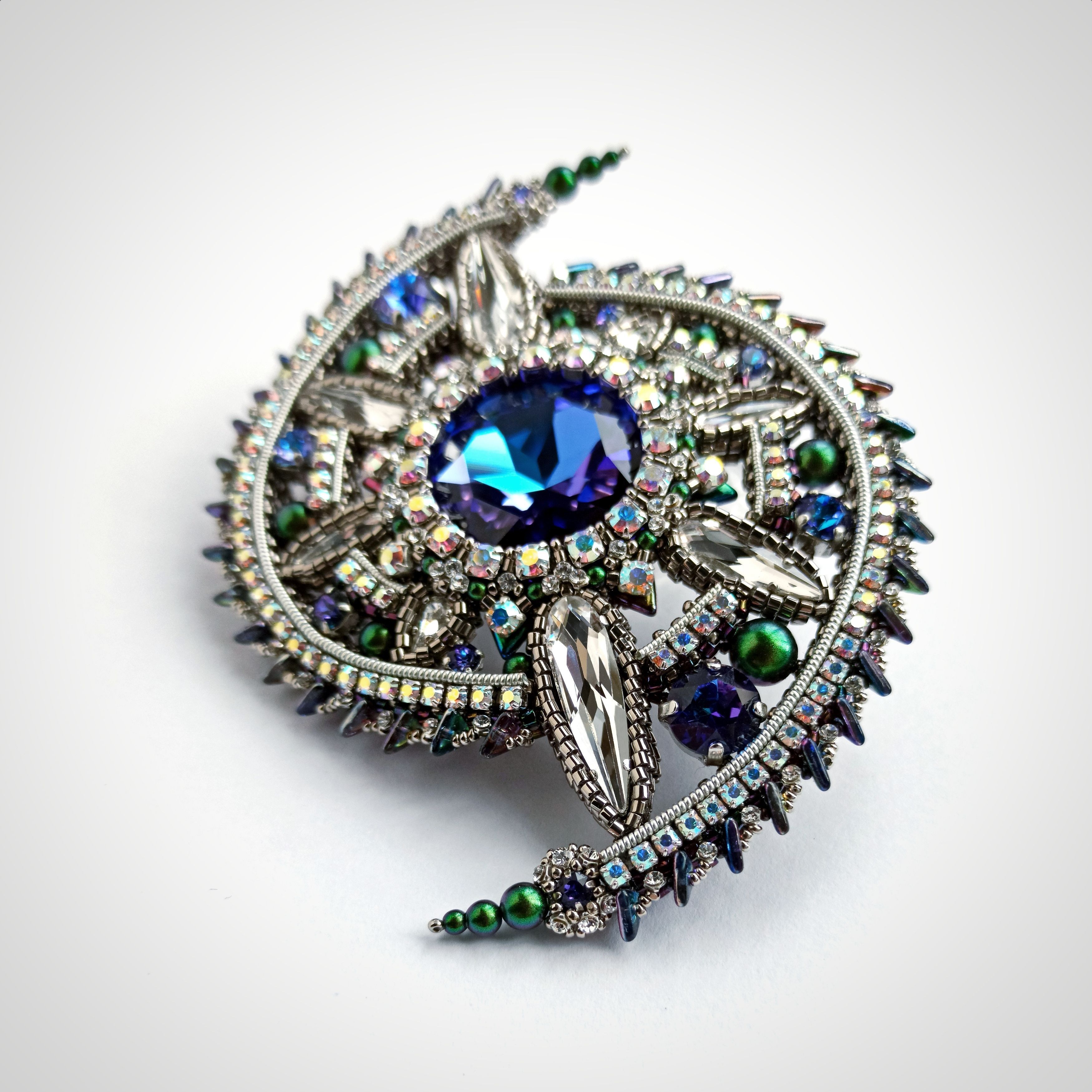 Брошь выполнена в различных техниках бисероплетения и при своей ювелирной проработке и огромном количестве деталей имеет размер около 8 см.