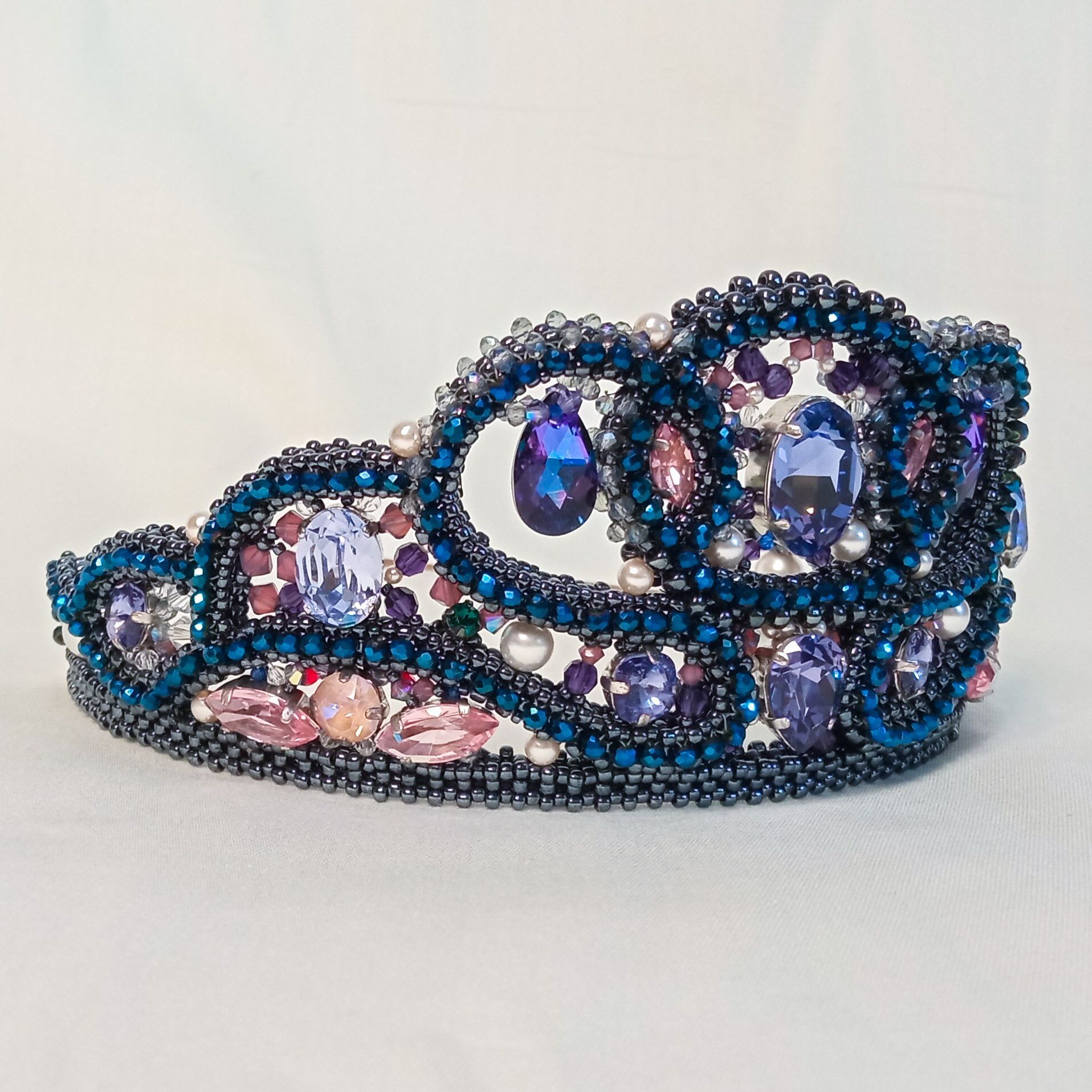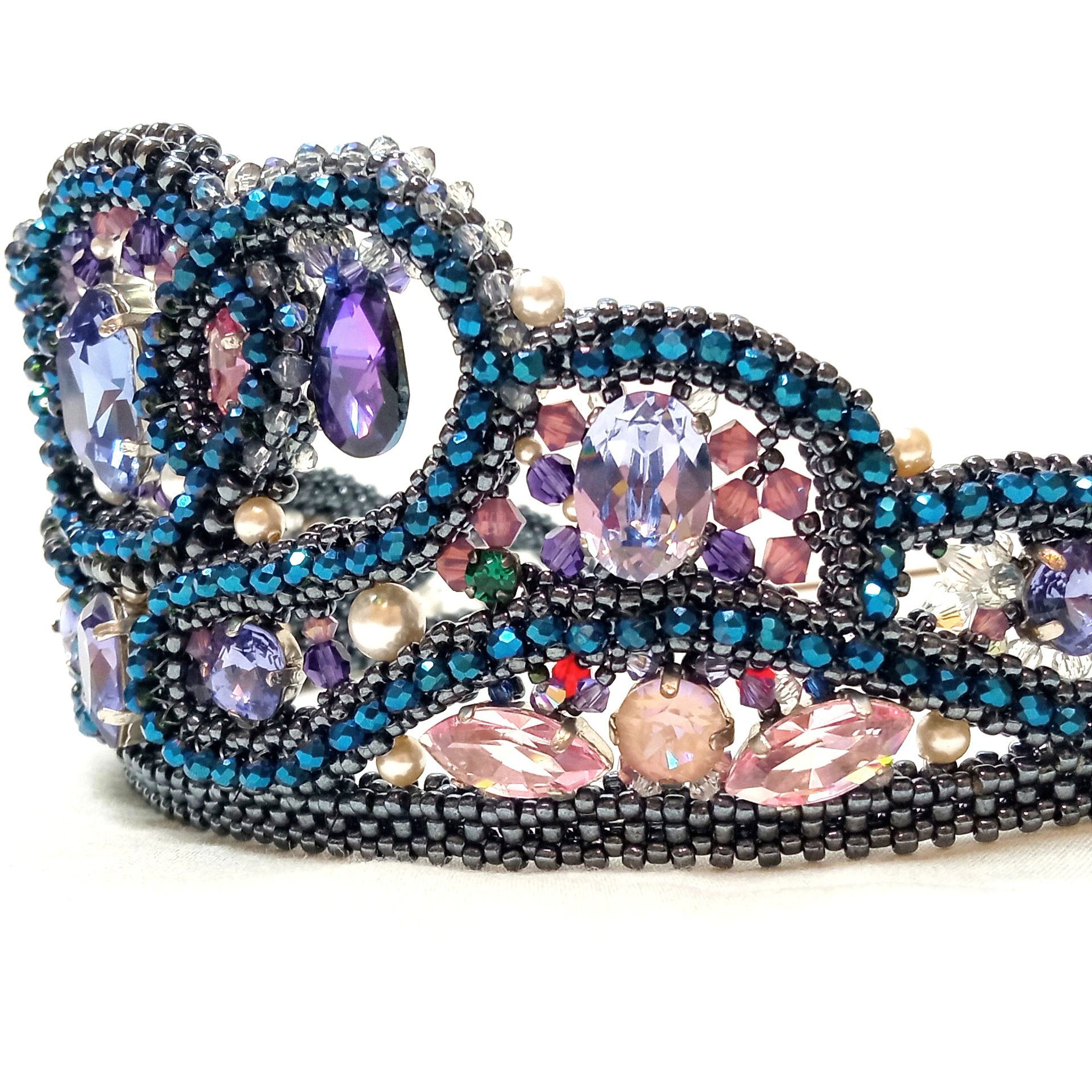 Данная работа выполнена в технике бисероплетения без использования металлического каркаса. Для фиксации на голове, в нижней части диадемы использована основа для ободка. Вес диадемы менее 100 грамм.