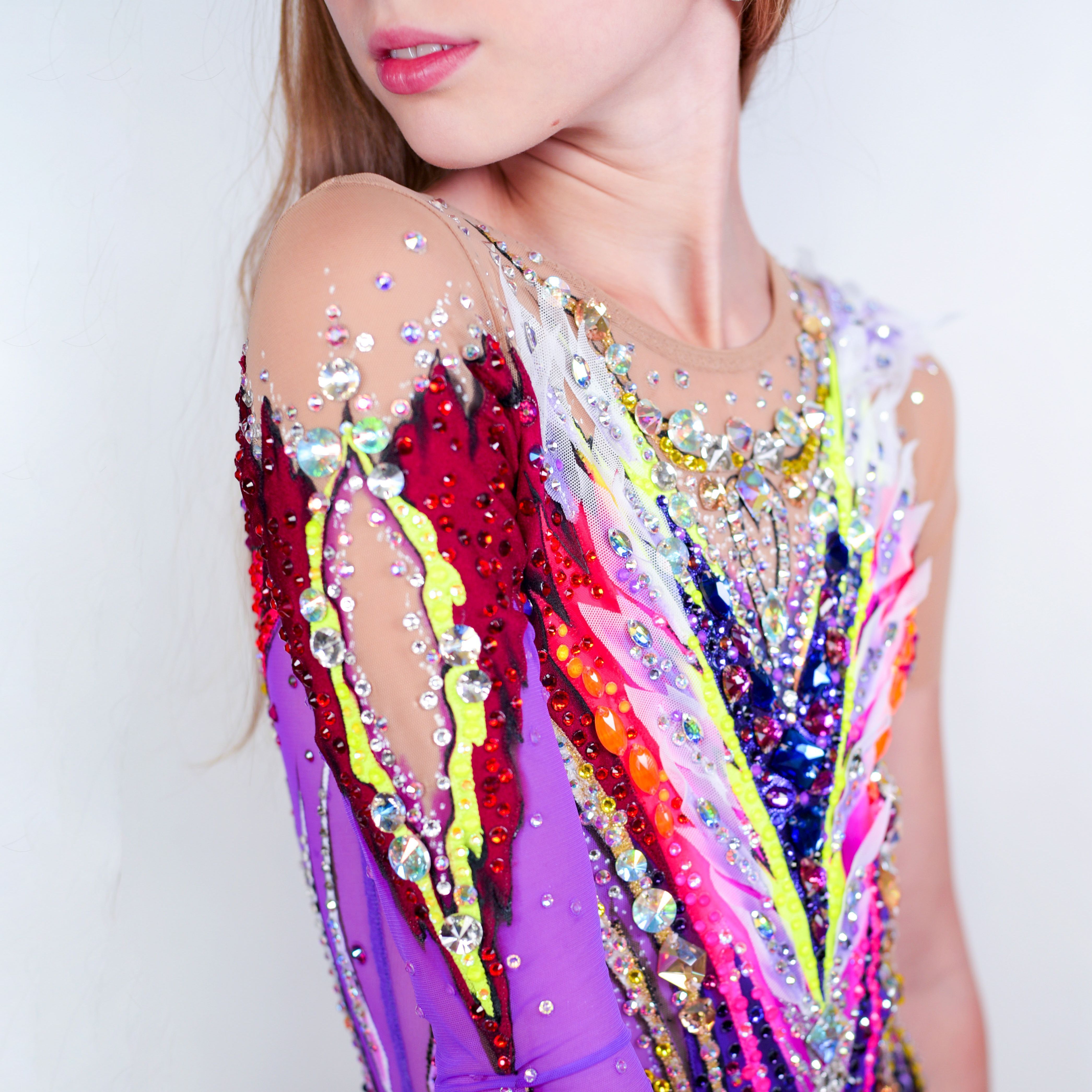 Создавая купальник «Чужестранка» мы взяли за основу фиолетовый цвет - цвет мудрости, трансформации и перевоплощений, а в сочетании с неоновым жёлтым, оранжевым и бордовым он создает противоречивый, вызывающий и яркий образ, который притягивает взгляд и практически заставляет обратить на себя внимание.
