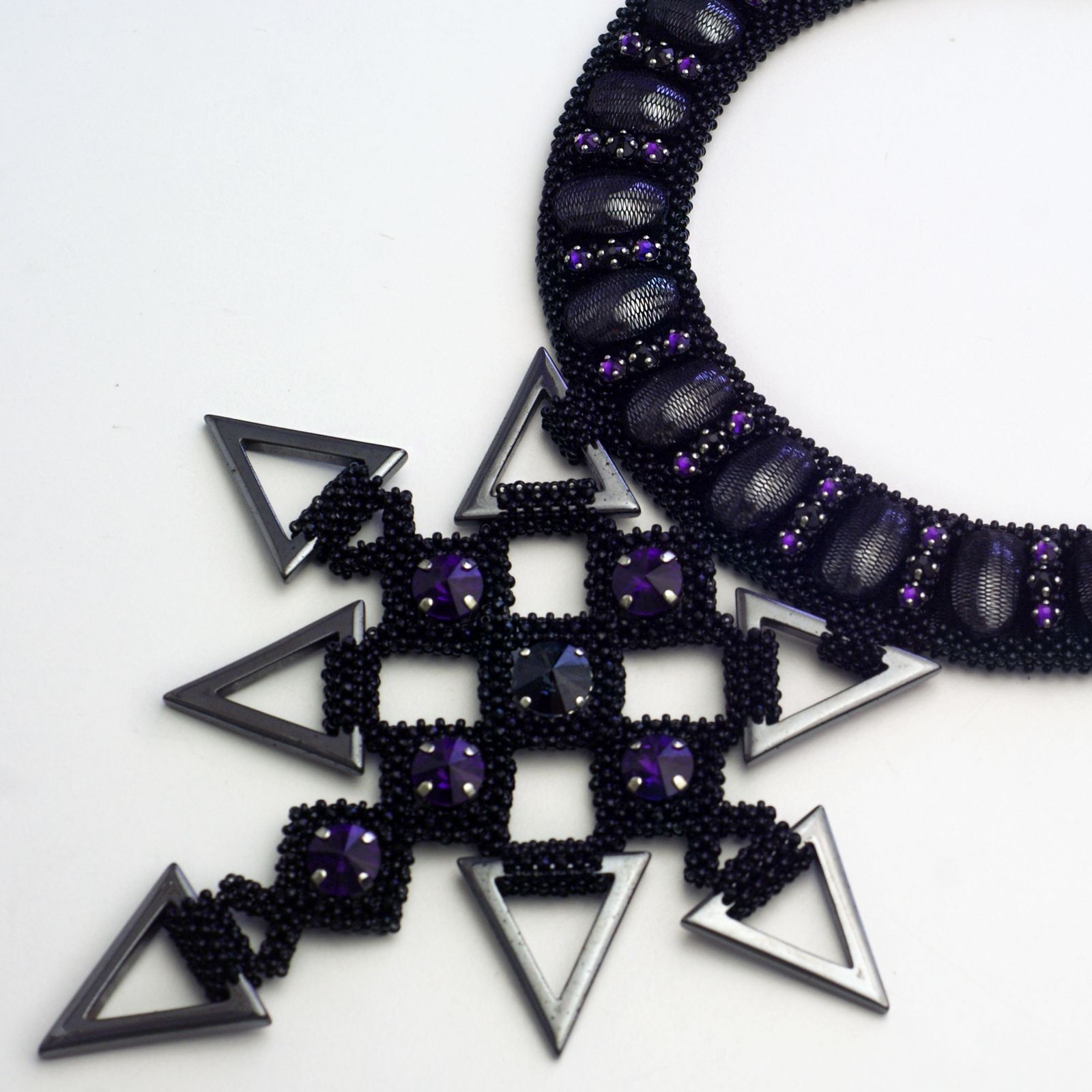 Колье выполнено из бисера с добавлением натуральных камней – подвесок и кабошонов из гематита, бусин шпинели. Колье выполнено в классической черной гамме с добавлением акцентов из кристаллов редкого цвета Purple Velvet.