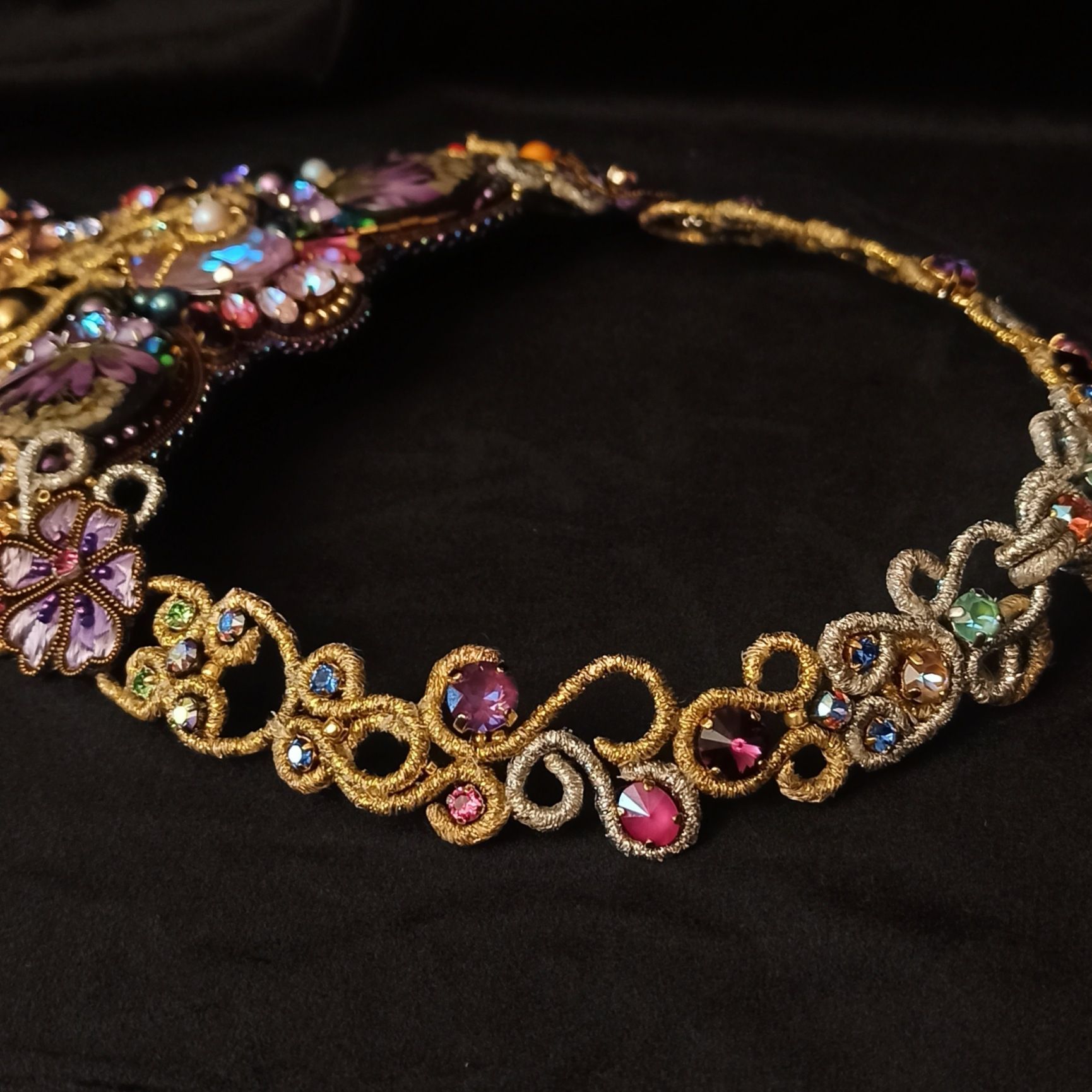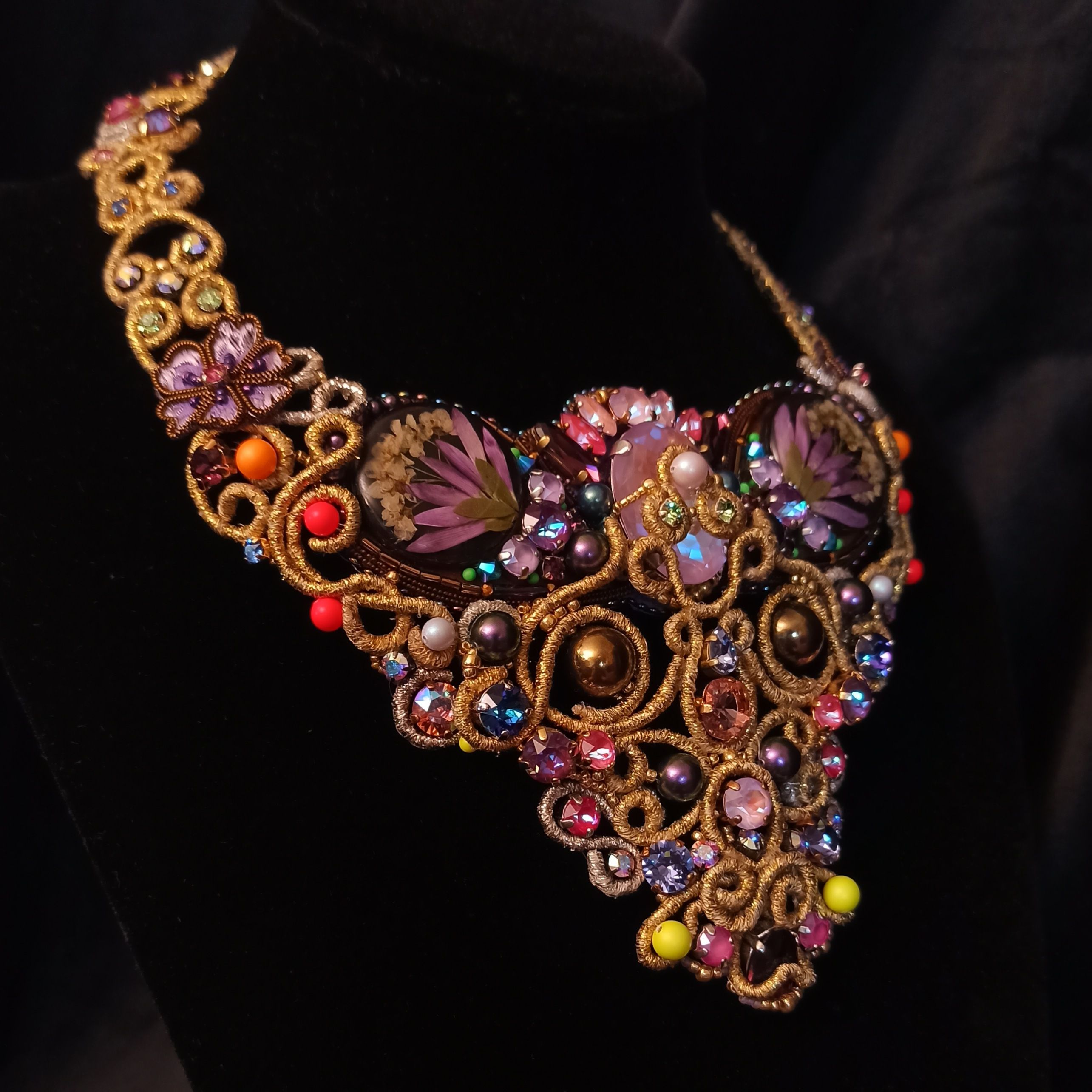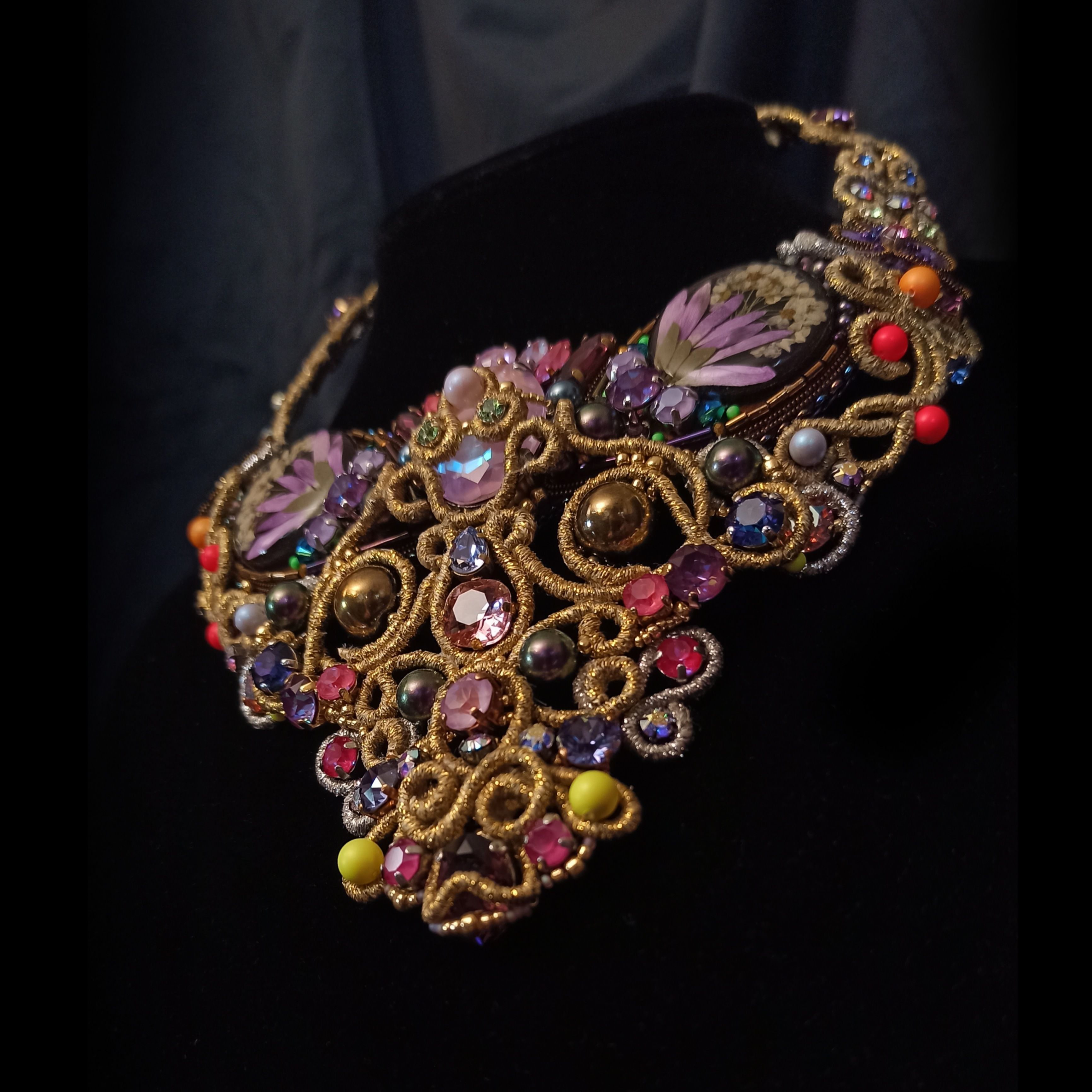 Когда была начата работа над этим колье, я не знала что получу в итоге. Конечно была задумка, эскизы, подбор кристаллов и жемчуга, но перечитывая название темы "Грани Вселенной .evoli" Раз за разом, я всё больше понимала, что хочу чтобы материалы мной "управляли". Глядя на основные цвета я задумалась, что же они означают. Сиреневый олицетворяет творчество, воображение, таинственность. Творческие поиски, открытость к переменам и стремление к развитию. Золотой символизирует солнце, несёт в себе решительность к действиям, бесстрашие, желание выделиться. И я поняла  что всё сходится! Именно в таком настроении я и пребывала, в поиске новой грани в себе, в решительности создать что-то необычное. Шаг за шагом, завиток за завитком, мысль за мыслью.. Так и появилось колье "Моя Вселенная". Его создание напомнило мне о том что граней великое множество не только в кристаллах, а в нас самих.. Каждый из нас и есть целая  многогранная Вселенная. Такая разная, неповторимая, глубокая.. Это колье о том, что внутренний мир огромен и прекрасен, о любви, о вдохновении, о мечтах, о возможностях...