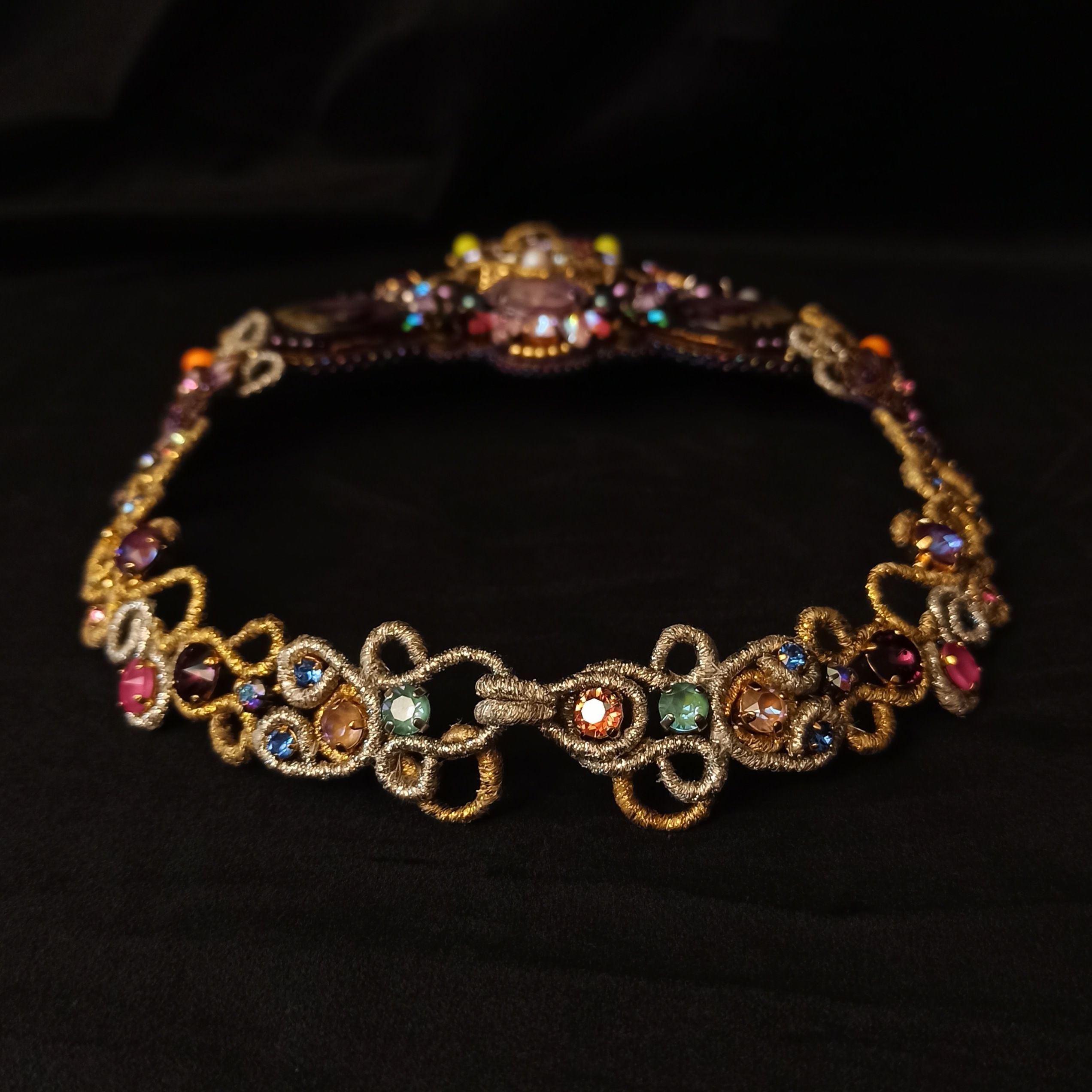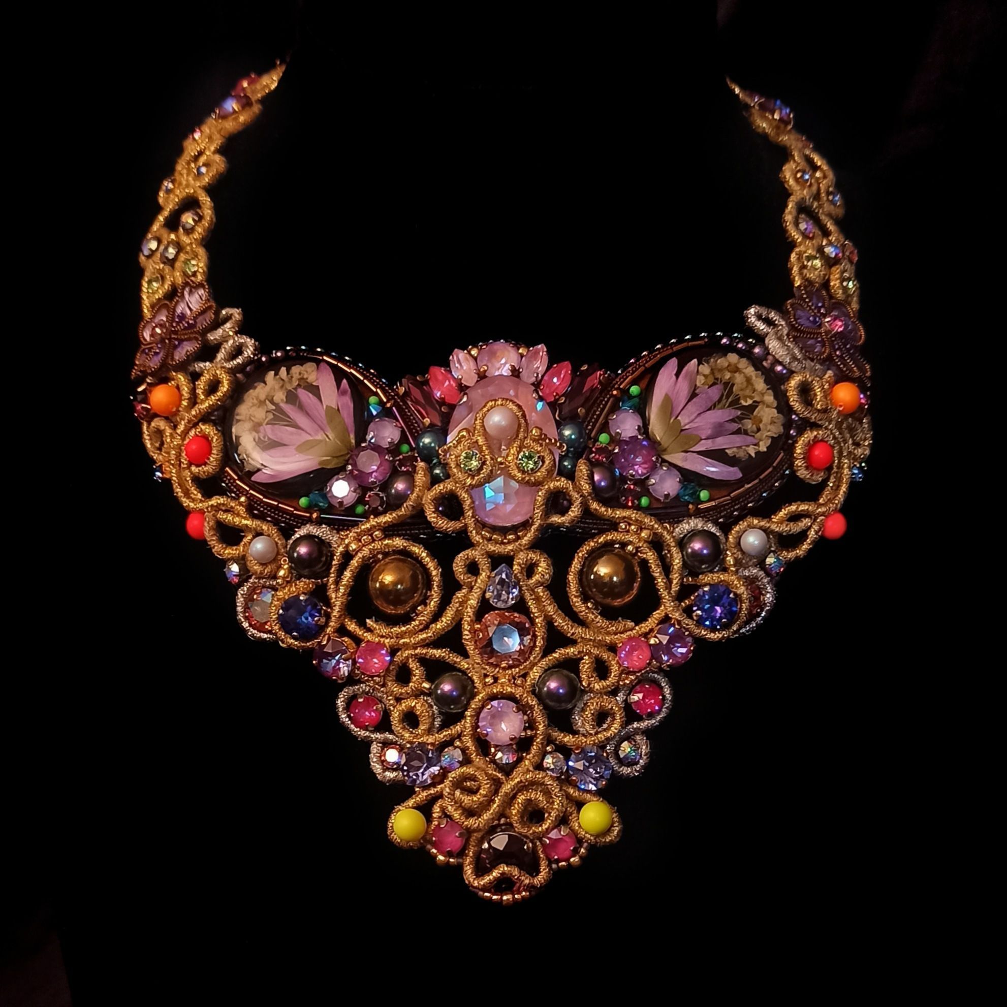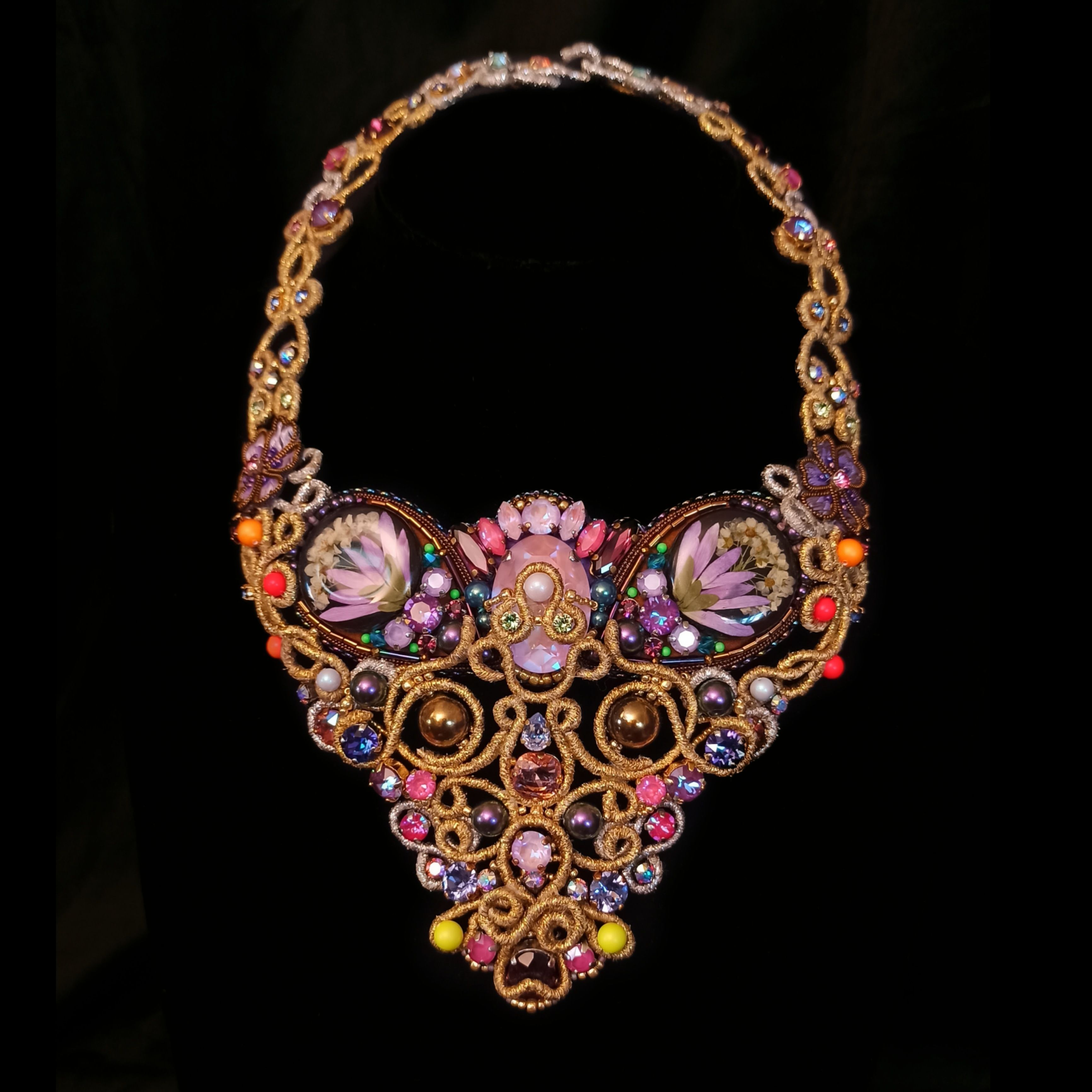 Когда была начата работа над этим колье, я не знала что получу в итоге. Конечно была задумка, эскизы, подбор кристаллов и жемчуга, но перечитывая название темы "Грани Вселенной .evoli" Раз за разом, я всё больше понимала, что хочу чтобы материалы мной "управляли". Глядя на основные цвета я задумалась, что же они означают. Сиреневый олицетворяет творчество, воображение, таинственность. Творческие поиски, открытость к переменам и стремление к развитию. Золотой символизирует солнце, несёт в себе решительность к действиям, бесстрашие, желание выделиться. И я поняла  что всё сходится! Именно в таком настроении я и пребывала, в поиске новой грани в себе, в решительности создать что-то необычное. Шаг за шагом, завиток за завитком, мысль за мыслью.. Так и появилось колье "Моя Вселенная". Его создание напомнило мне о том что граней великое множество не только в кристаллах, а в нас самих.. Каждый из нас и есть целая  многогранная Вселенная. Такая разная, неповторимая, глубокая.. Это колье о том, что внутренний мир огромен и прекрасен, о любви, о вдохновении, о мечтах, о возможностях...