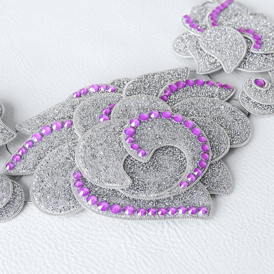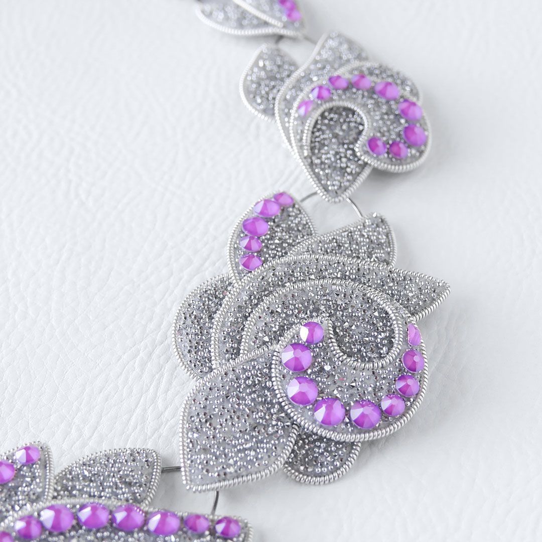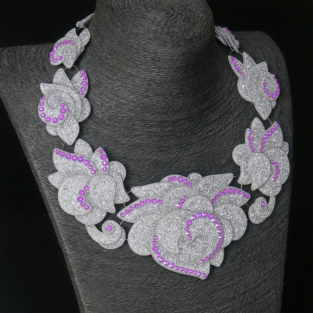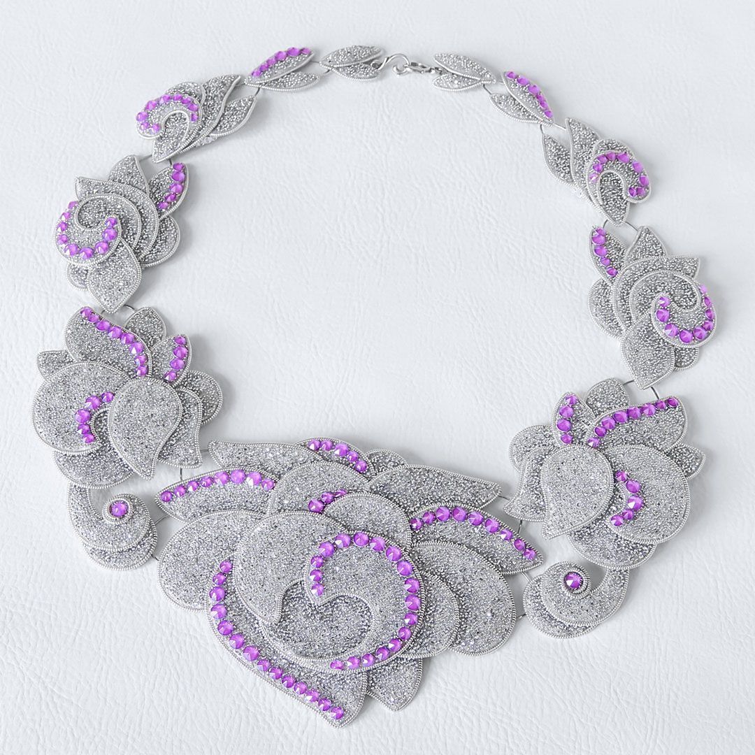 Колье состоит из 11 подвижных элементов, которые собраны более чем из 70 крохотных деталей, выполненных из кристальной ткани .evoli. И на этом «холсте» проявляются первые крупицы и расцветают «робкие ростки» зарождающейся идеи, воплощённые с помощью кристаллов Electric Violet, и как нельзя лучше иллюстрирующие основную мысль этой работы.