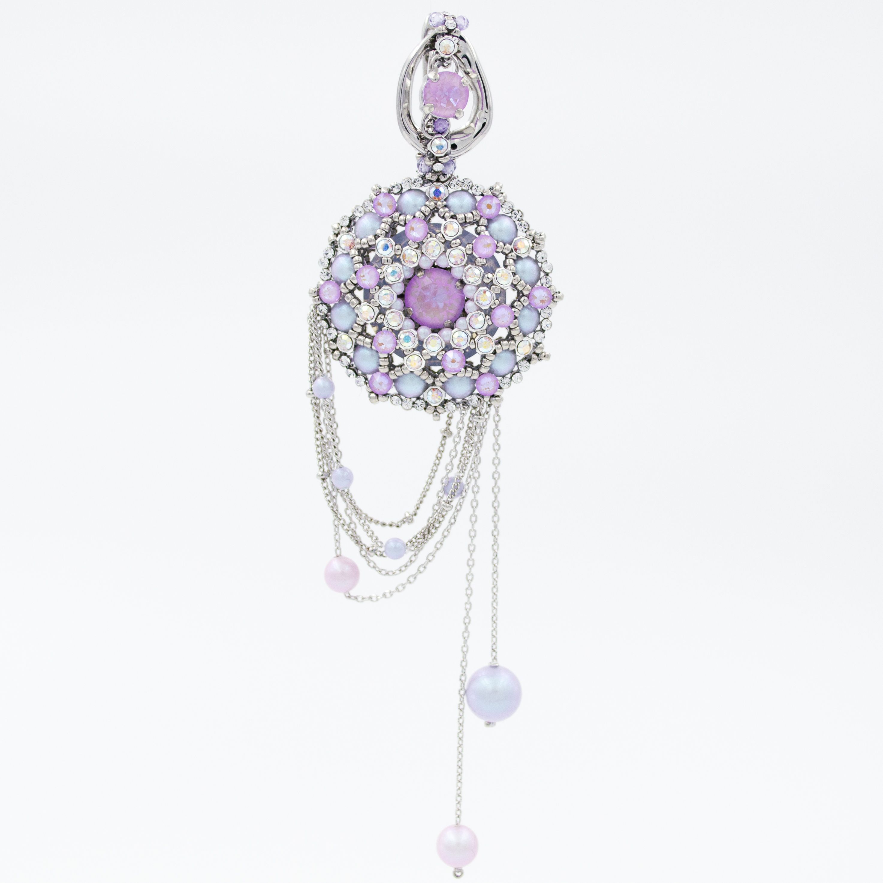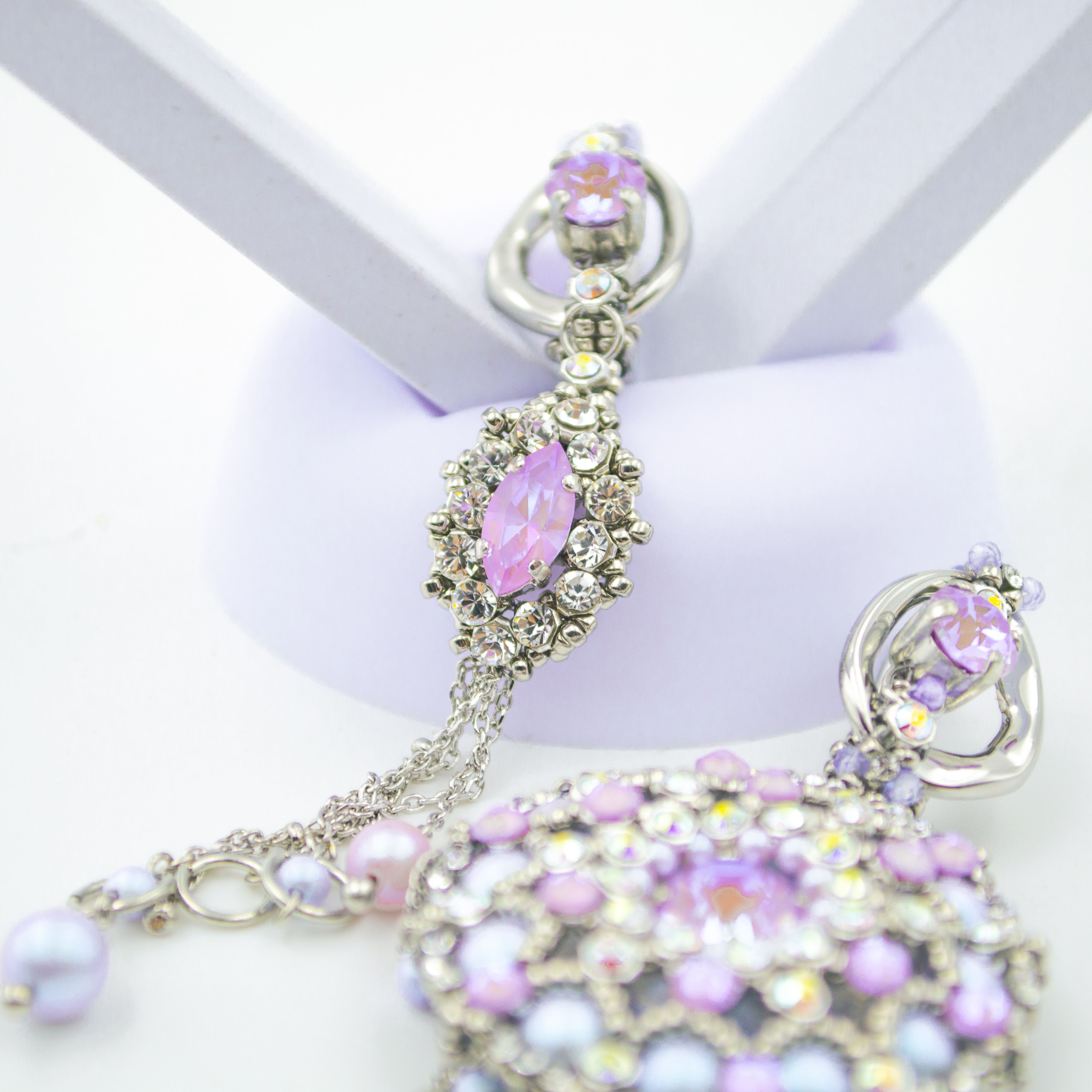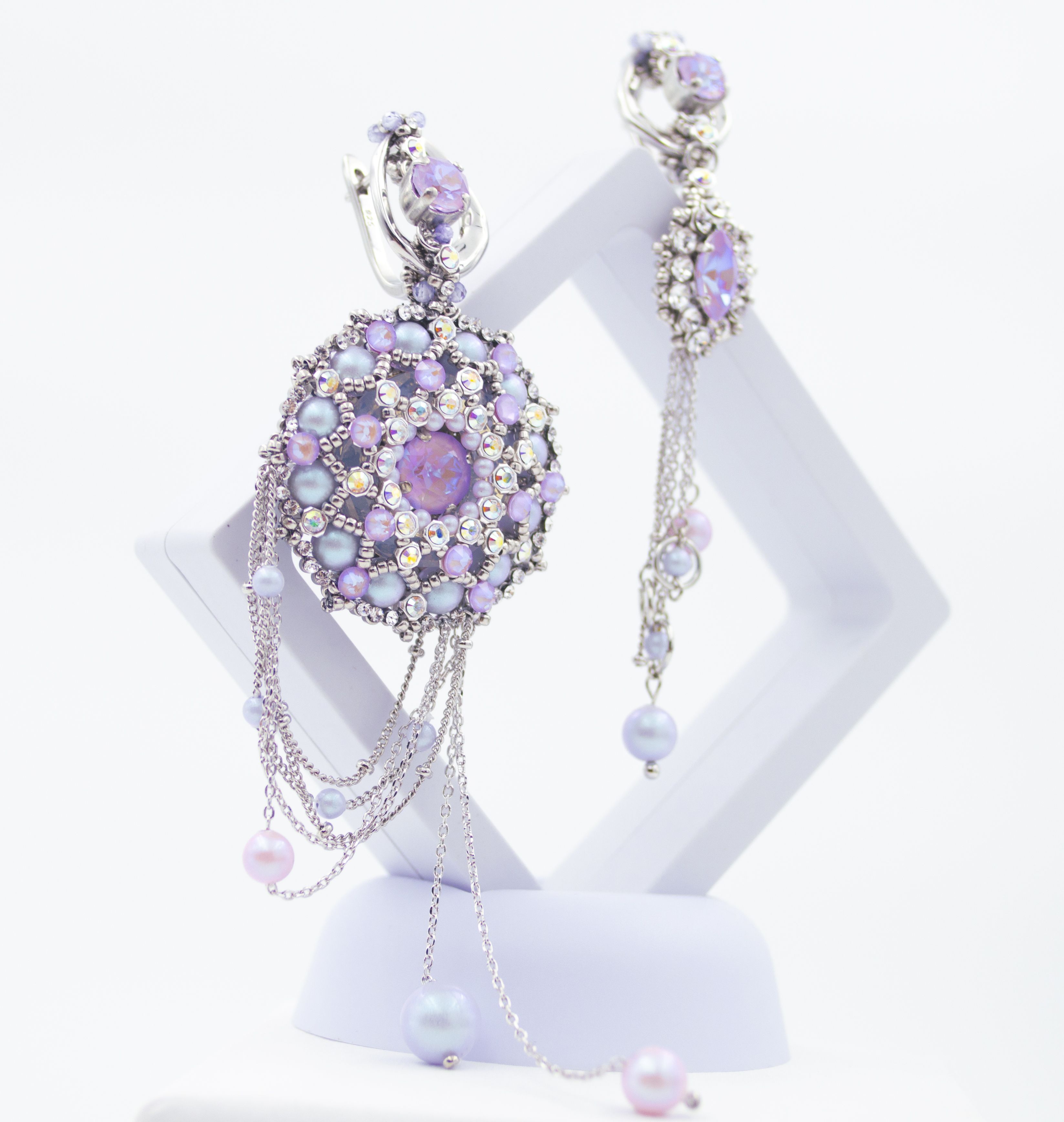 Серьги выполнены с использованием техник плетения и инкрустации мельчайшими кристаллами.