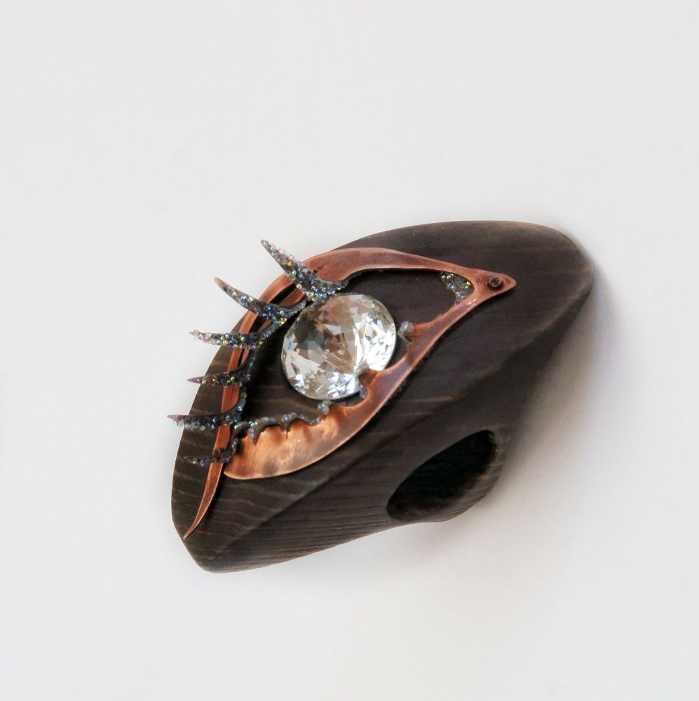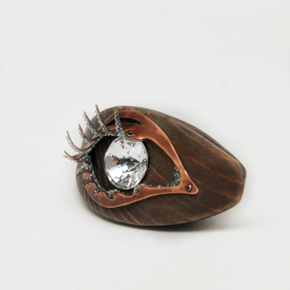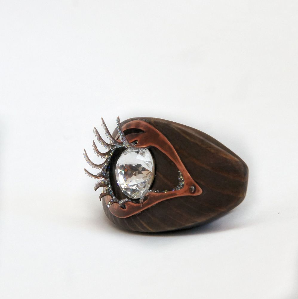 Идея открытия Третьего глаза была воплощена в коктейльном кольце. Крупное основание кольца необычной формы завершается гладкой выпуклой поверхностью, на которой проступают утонченные очертания глаза. По контрасту с природным теплым материалом (древесиной) и "текучими" изгибами основания силуэт Глаза выполнен из металла (меди) и сочетает в себе плавные линии контура с тонкими острыми длинными ресницами. С внутренней стороны ресницы и веки задекорированы кристальной тканью swarovski. Центром композиции является зрачок - крупный (18 мм) круглый кристалл swarovski новой формы Dome round stone. Если всматриваться в него, то создается эффект погружения в неизвестное, сияющее пространство… Глаз как-бы распахивается навстречу смотрящему, призывая заглянуть в неизведанное, увидеть новые грани мира.