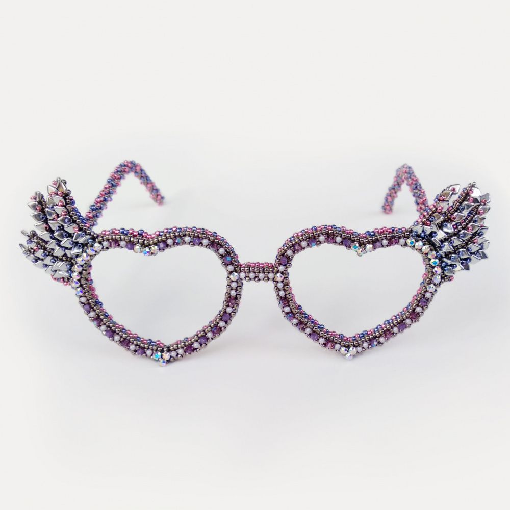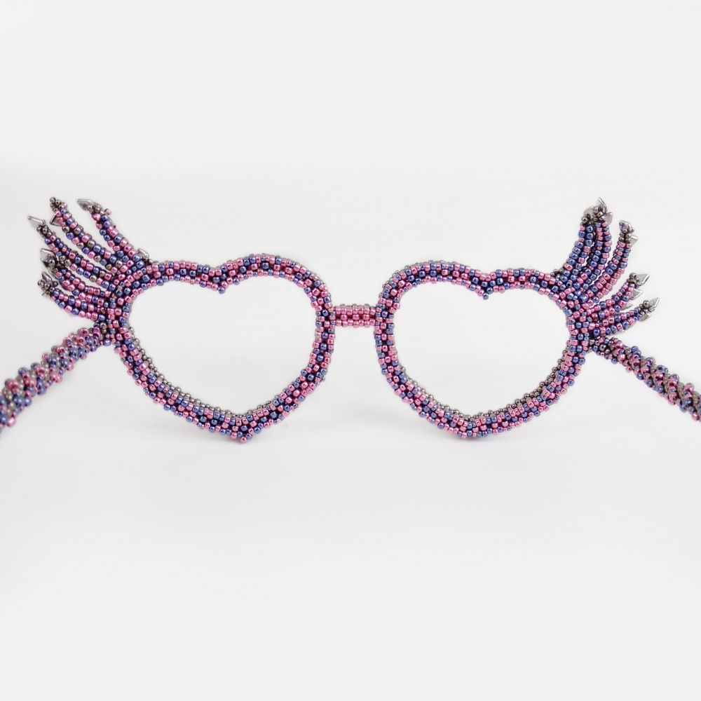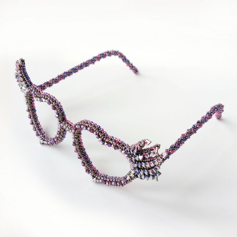 Очки созданы в технике бисероплетения, в дужки вставлена проволока для жесткости. Передняя часть очков держит форму полностью за счет плетения.