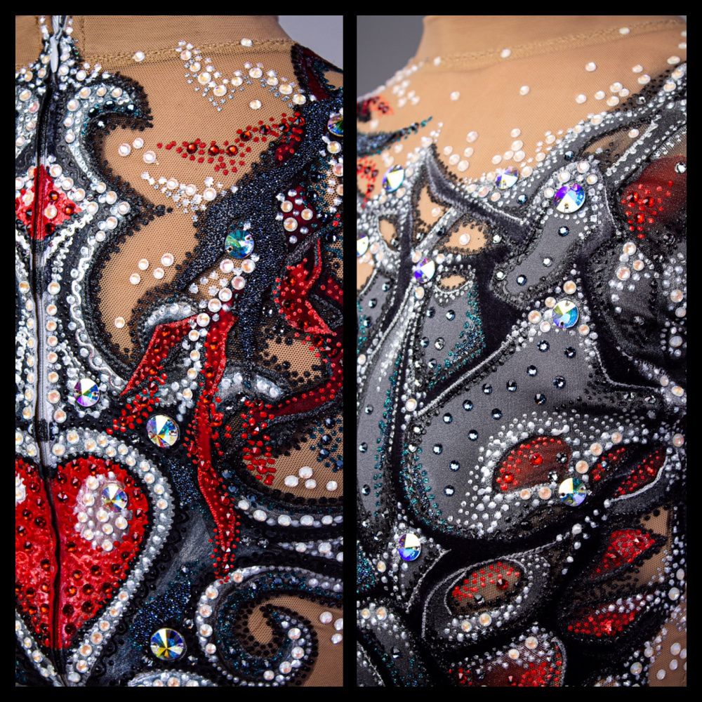 Дизайн костюма под композицию La haine был придуман специально для спортсменки (на фото), учитывая её пожелания и особенности фигуры. В образе постаралась соединить и лиричность развивающейся мелодии с трагической кульминацией, и экспрессию, с которой спортсменка передает свой образ, поставленный хореографом. Передняя часть костюма символизирует «работу» души и поиски ответов на вопросы. Доминирующим акцентом костюма является крест на спине, который, с одной стороны, символизирует любовь и покорность, а с другой - стойкость и целеустремлённость его обладательницы.