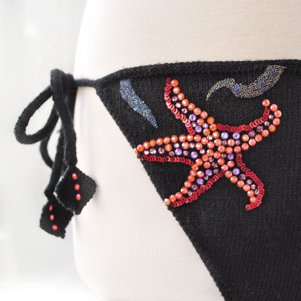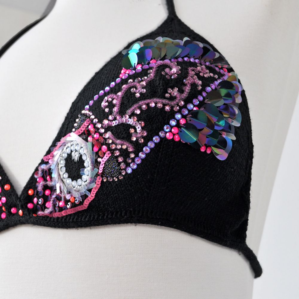 Материалы для дизайна выбраны по принципу легкости, поэтому основным материалом стали клеевые кристаллы, которые можно использовать в купальниках для плавания, а так же пайетки.