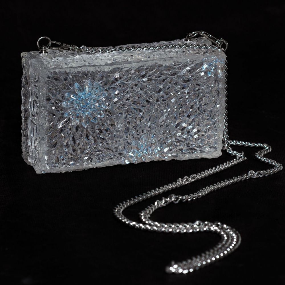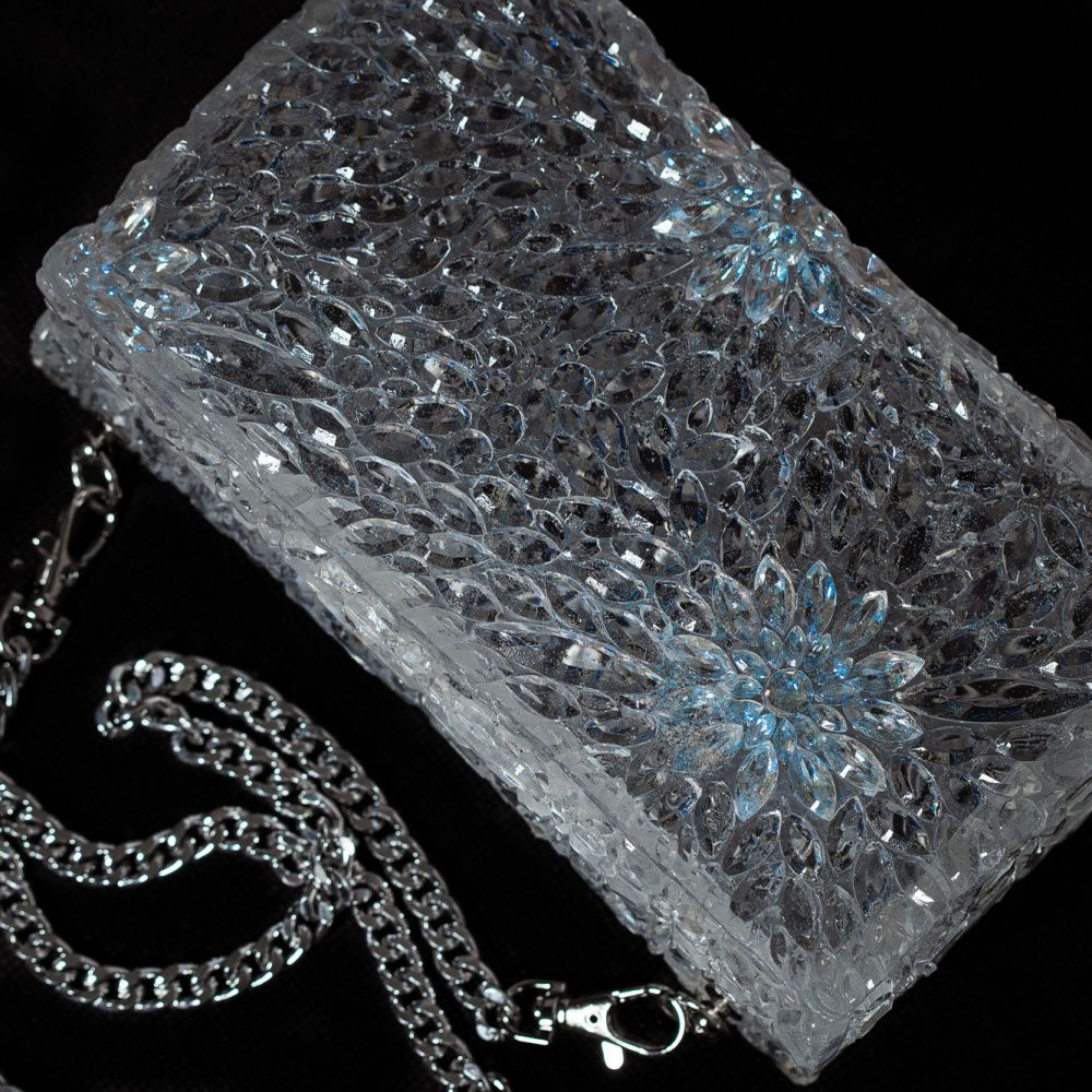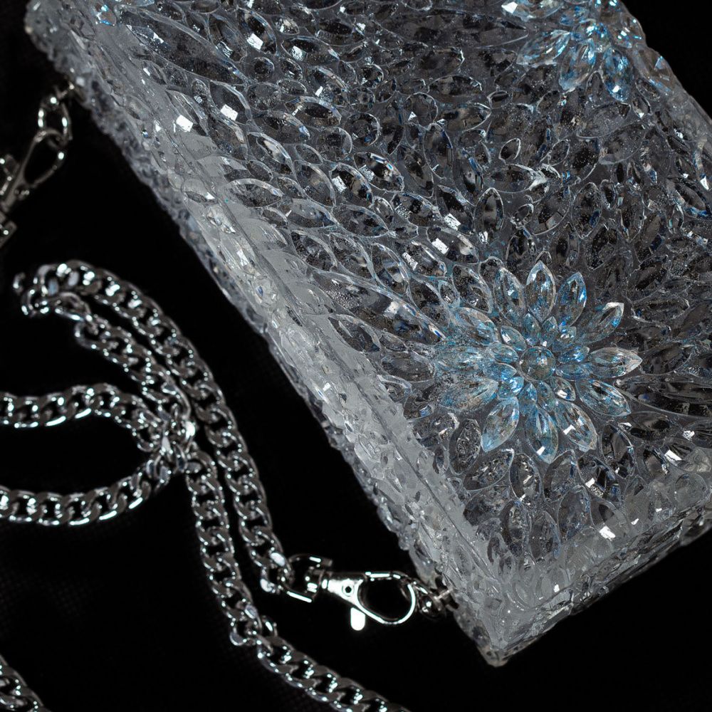 Сумочка отлита из эпоксидный смолы имитирующей хрусталь с вставками кристаллов Swarovski в цвете Crystal Ignite.