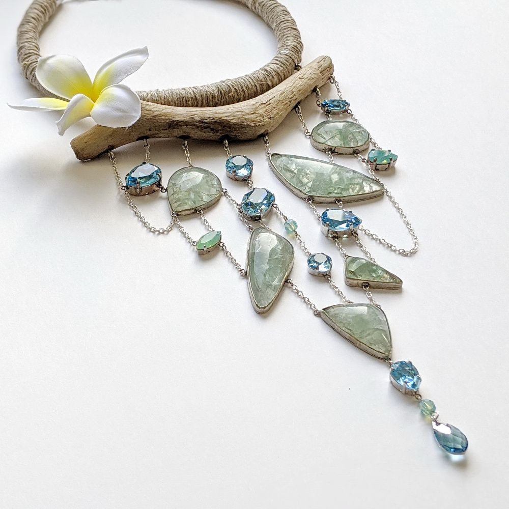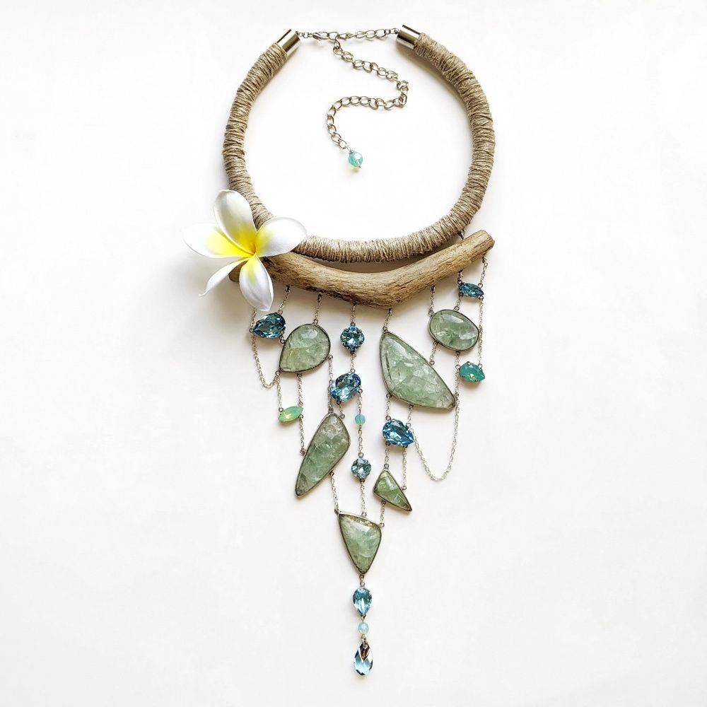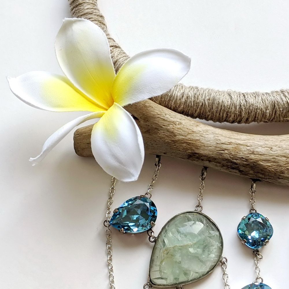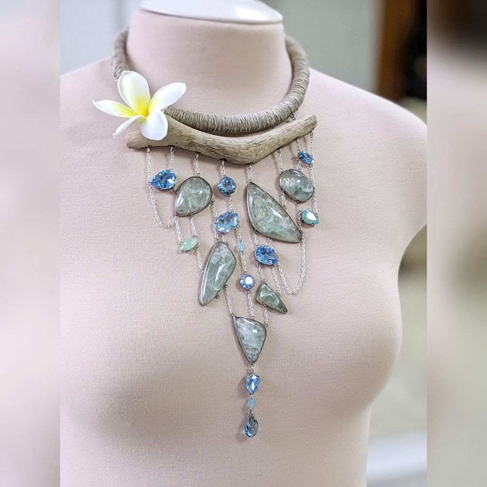 Химия между нами случилась в секунду. Прекрасные прозрачные кристаллы и такие же прозрачные натуральные флюориты. Все оттенки воды, текучая форма, максимально простой дизайн и экологичные материалы. Я только осваиваю ювелирные техники, но идея требовала именно такого воплощения. Мне хотелось вывести на первый план природные фактуры и показать: это сочетание, элитные кристаллы и натуральные материалы, имеет право на жизнь! Своеобразный вызов миру гламура, красота простых форм и чистых цветов.