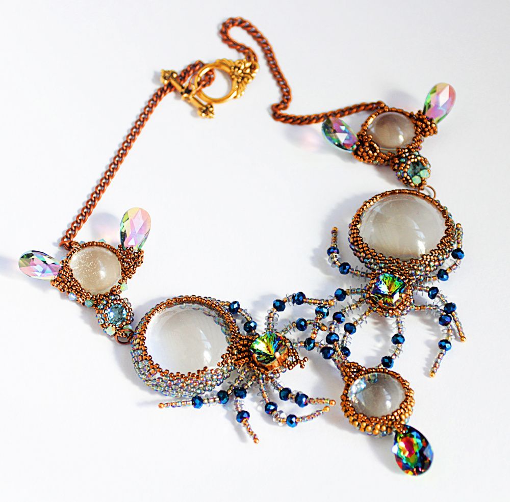 Очень хотелось показать,что обычный стеклянный кабошон тоже может сиять. Мои прозрачные, как будто созданные из воды пауки охотятся на таких же невесомых мух. Так я вижу новые грани сияния.