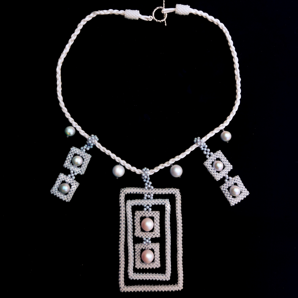 Колье Эскимо — это розовый и голубой жемчуг из новой коллекции Swarovski в прямоугольных рамках из бисера. Лаконичное украшение в котором можно "и в пир, и в мир".