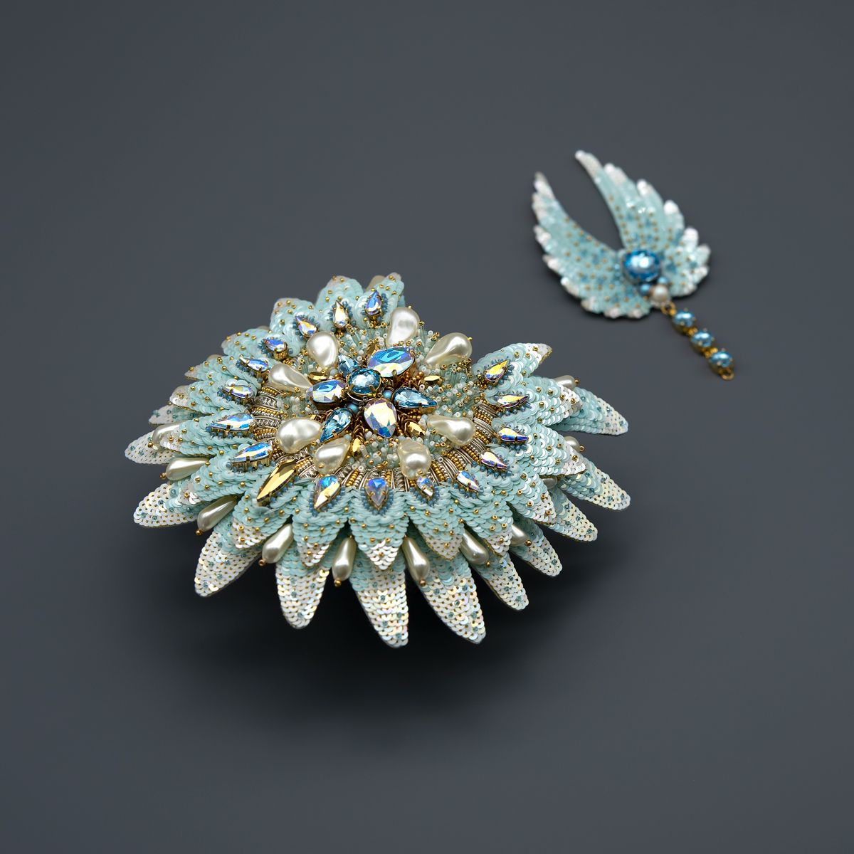Нежно-голубая цветовая гамма, в сочетании с золотой фурнитурой, создает атмосферу небесной легкости и величия, а каплевидные и круглые кристаллы Swarovski напоминают слезы радости или капли росы, которые переносят нас в миры чудес и загадок. В своей работе я постаралась  изящно переплести  реальное ( фактуру, цвет)с фантастическим ( форма и содержание), выявляя тонкую грань между нашей природой и мистическими тайнами зазеркалья.