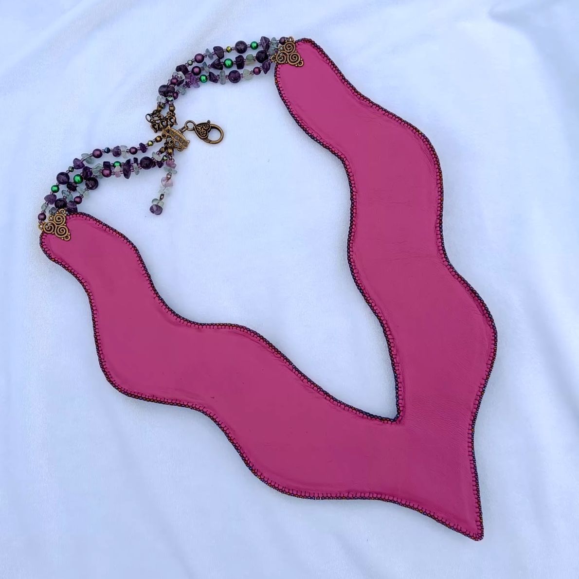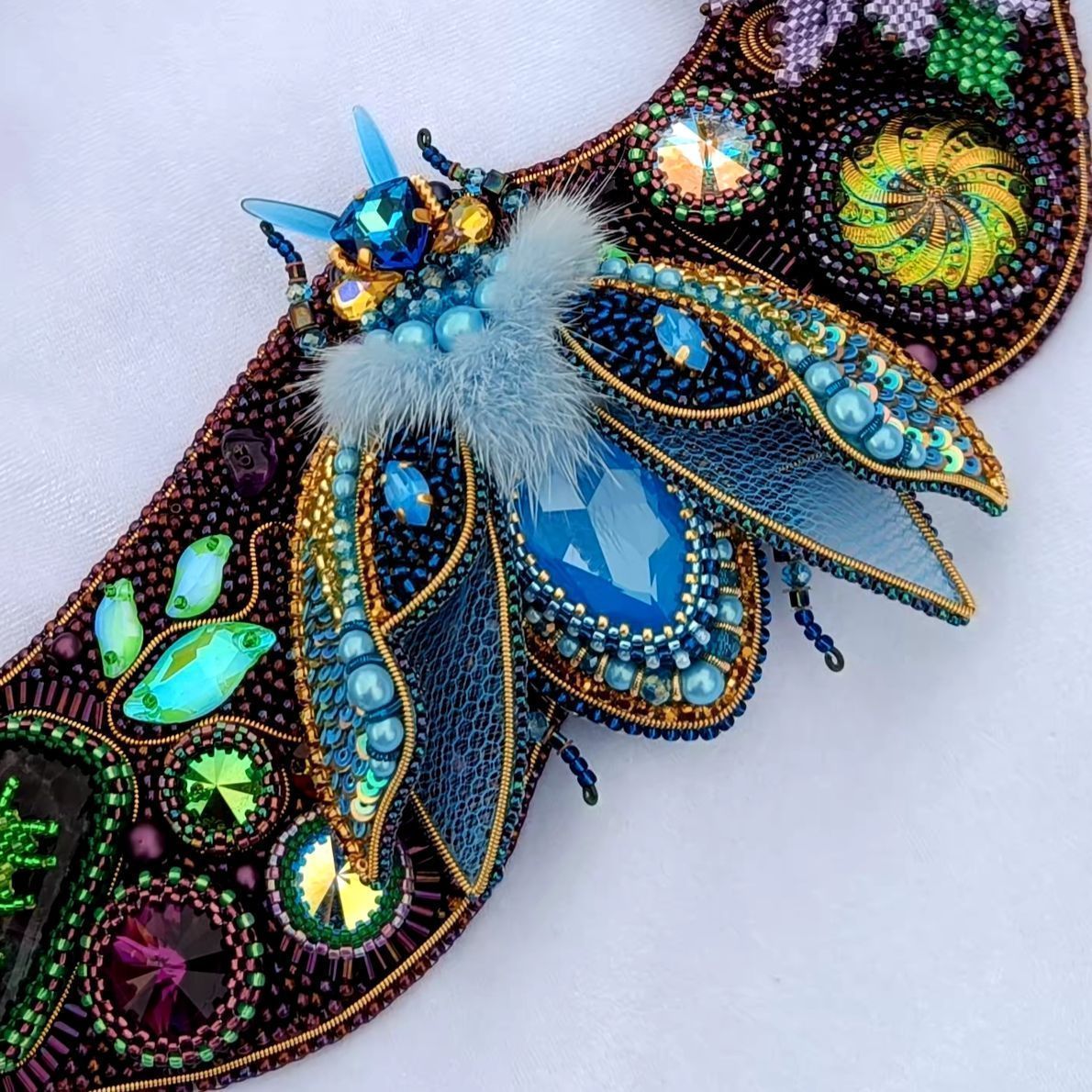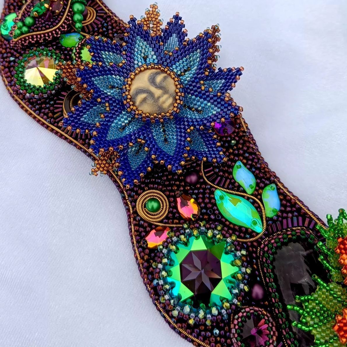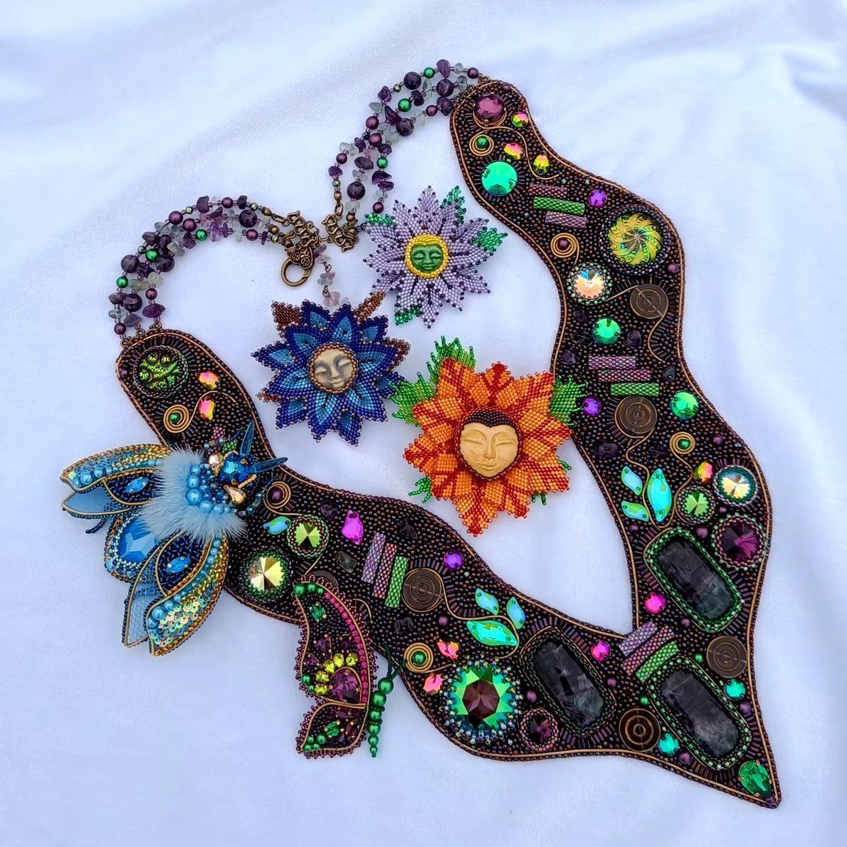 Аметистово-зеленая основа с растительным узором расшита кристаллами, флюоритами, аметистами, богемскими пуговками и бусинами лэмпворк. Это благородный и дорогой сад камней, богатство которого в материалах, формах, глубине цвета.