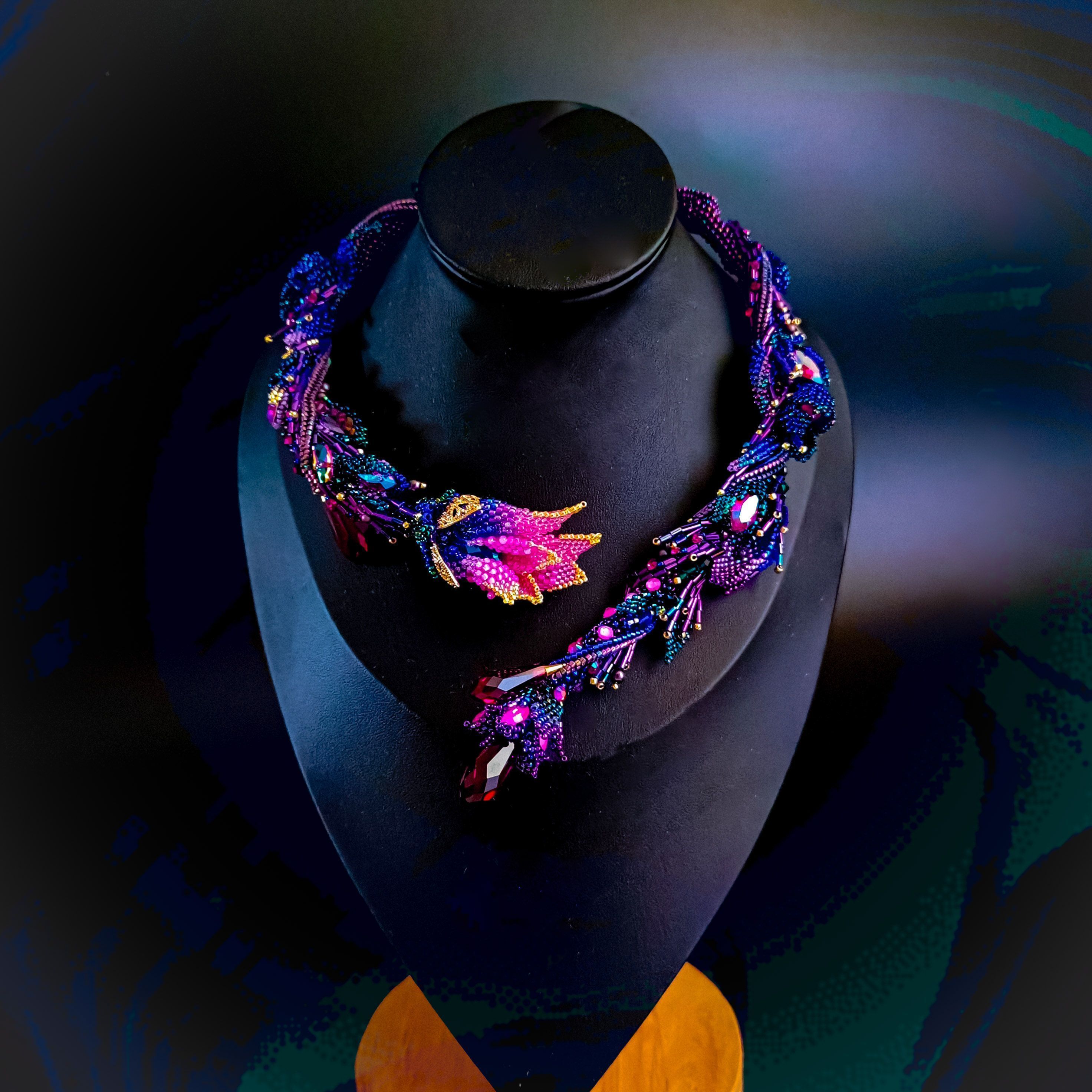 Однажды юная фея-ювелир, очарованная этим зрелищем, решила увековечить танец цветка. Она собрала капли лунного света, нити звездной пыли и росу с лепестков. Ночь за ночью фея плела удивительное ожерелье, вплетая в него грацию и магию танцующего цветка.