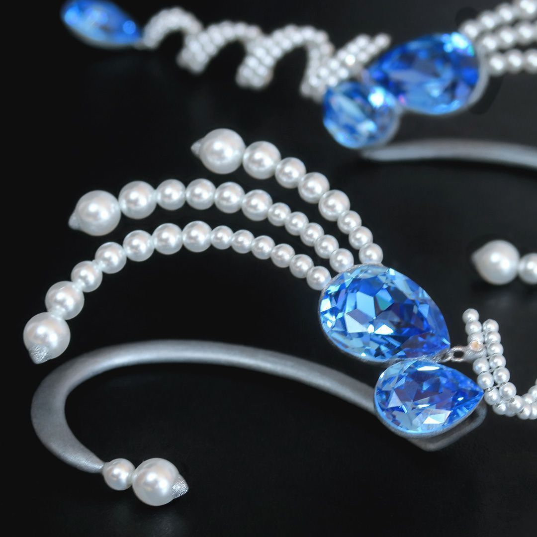 Отправной точкой украшения стали кристаллы нового холодного оттенка Ice Blue и сдержанный серебристый жемчуг Moonlight. Уравновешенный глубокий синий хорошо передаёт спокойствие необъятного, безбрежного моря, а сверкающие хрустальные бусины, соединённые в незатейливые конструкции, согласно задумке не только подчеркивают лёгкий трепет зыбкой волны, но и привносят ощущение свободы и полёта.