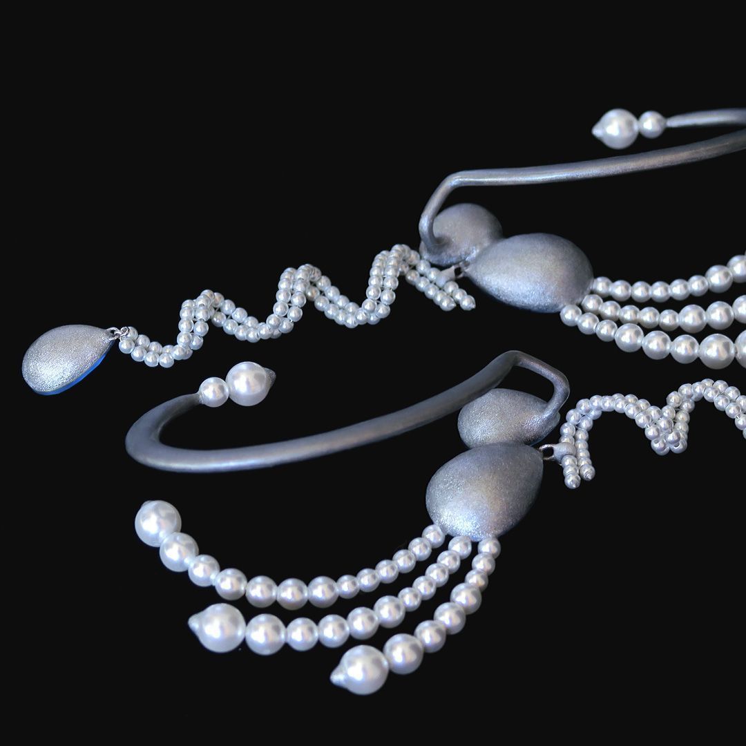 Украшение парное, выполнено в виде кафф. Их конфигурация полностью разработана и создана с нуля собственноручно. Все элементы собраны в единую монолитную структуру, за исключением подвижного подвеса, который добавляет небольшой игривости запечатлённому образу.