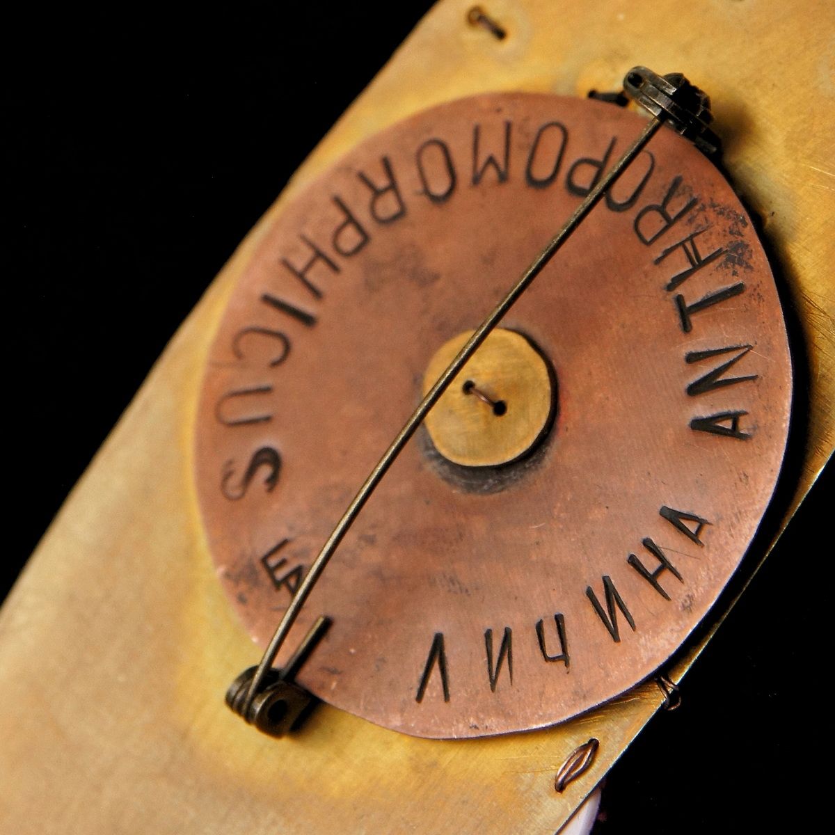 Anthropomorphicus весОма (~ 45 гр), по размерам максимально приближена к археологическому прототипу (15,7 * 4 см). На обороте расположен медный диск с названием броши.