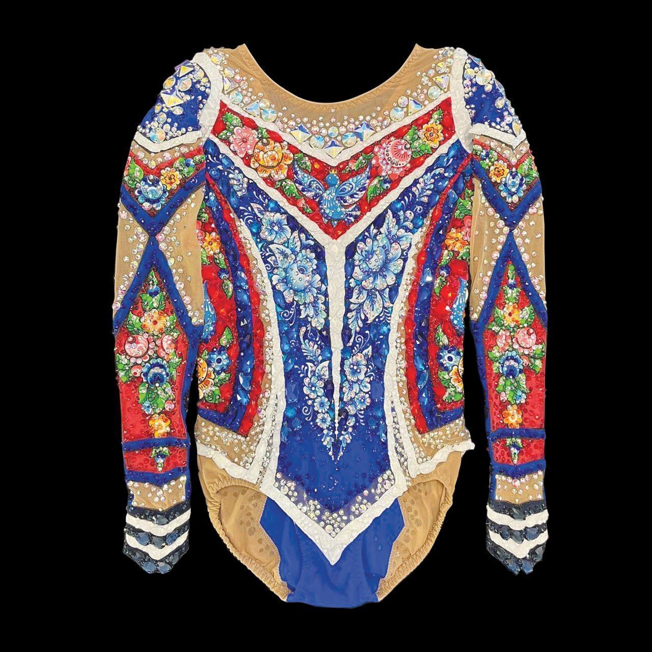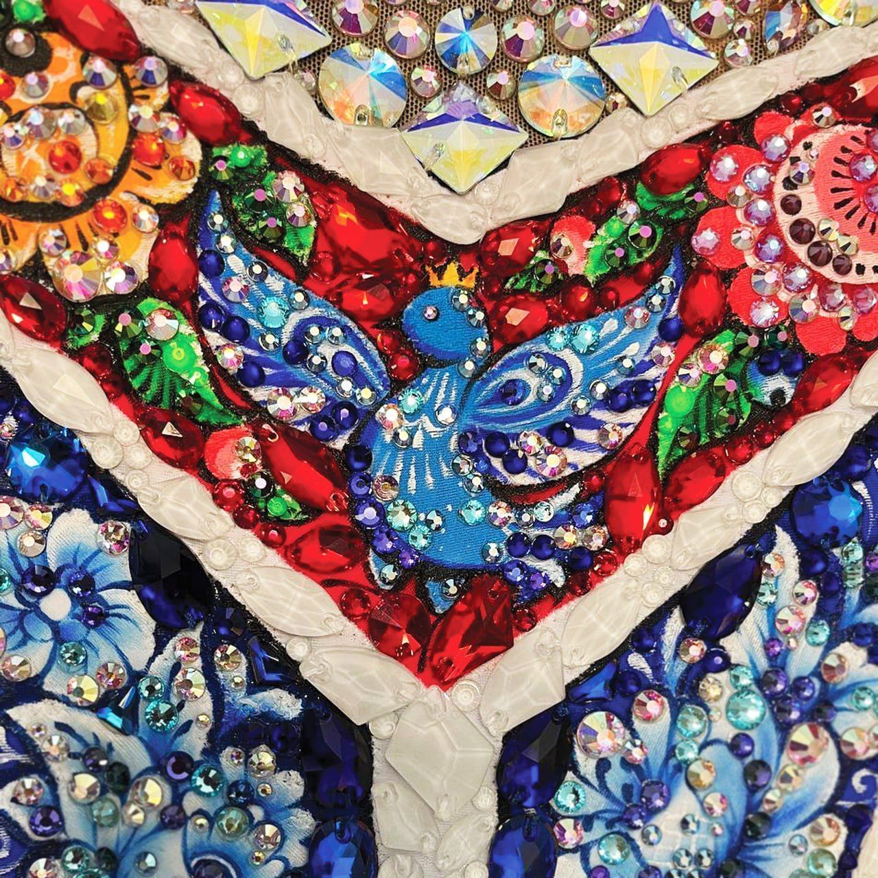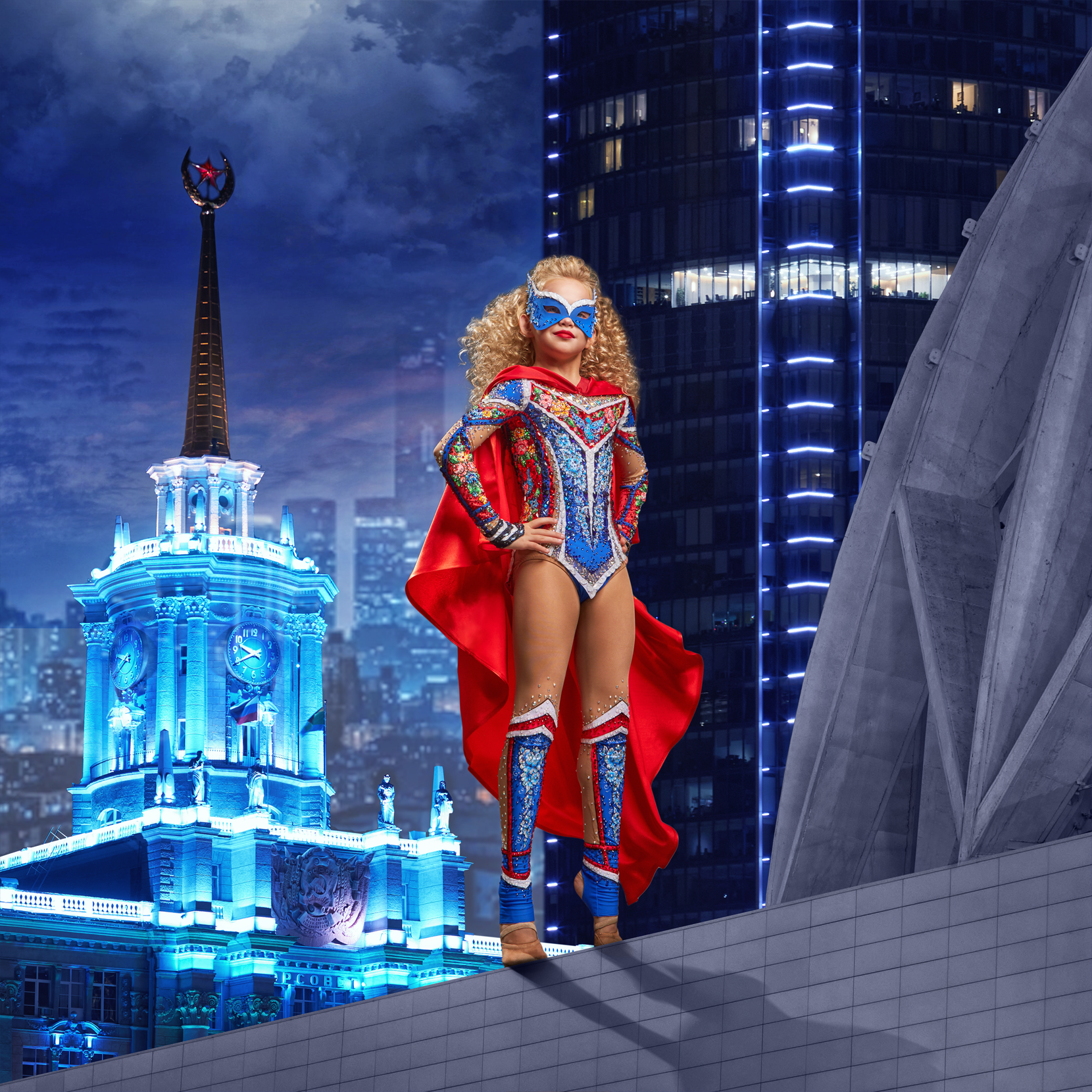 Свет прожектора выделяет хрупкую фигурку девушки. Её наряд, купальник с ярким орнаментом и расписными элементами. Сила Гжель-девицы – в наследии предков, в культуре и самобытности русского народа. Сила в красоте, трудолюбии, таланте, искусстве, мудрости предков, верности традициям. Гжель-девица стоит на страже традиций России.