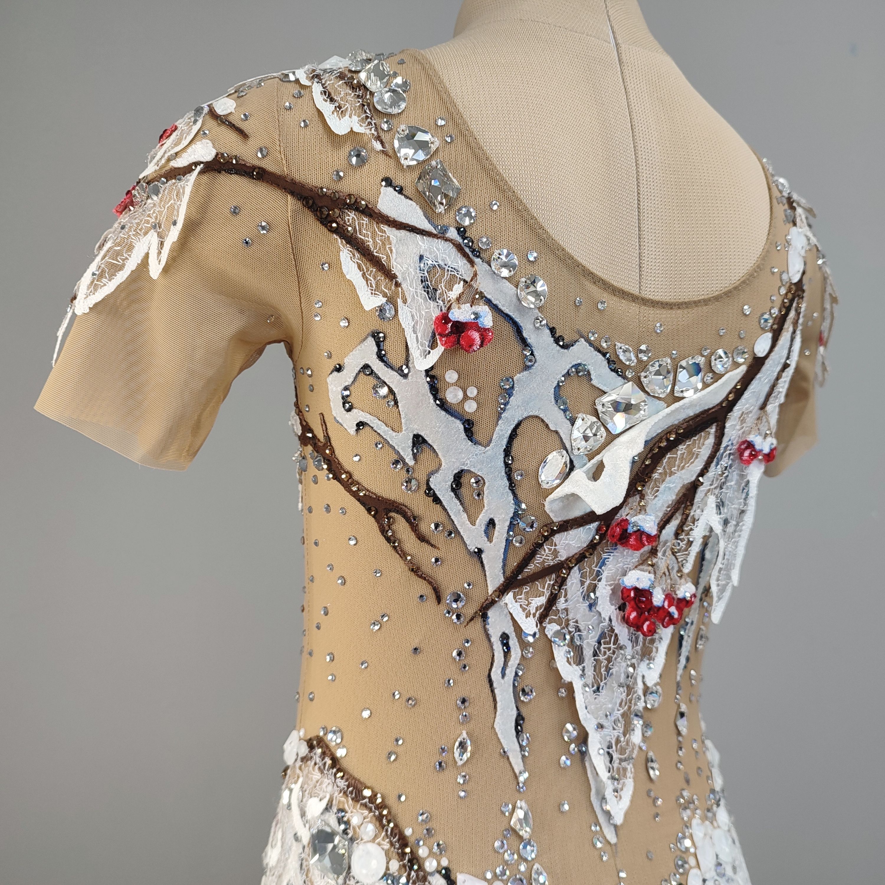 Так и получился этот белоснежный купальник, в центре композиции которого красногрудые птицы. И на каждой грудке вы найдете конкурсные кристаллы.