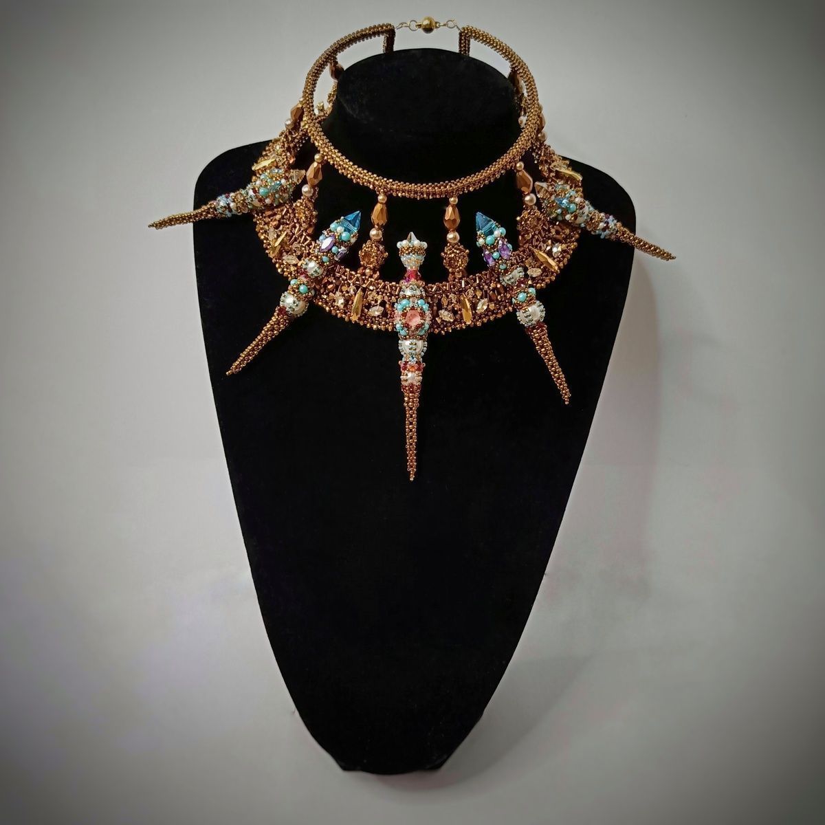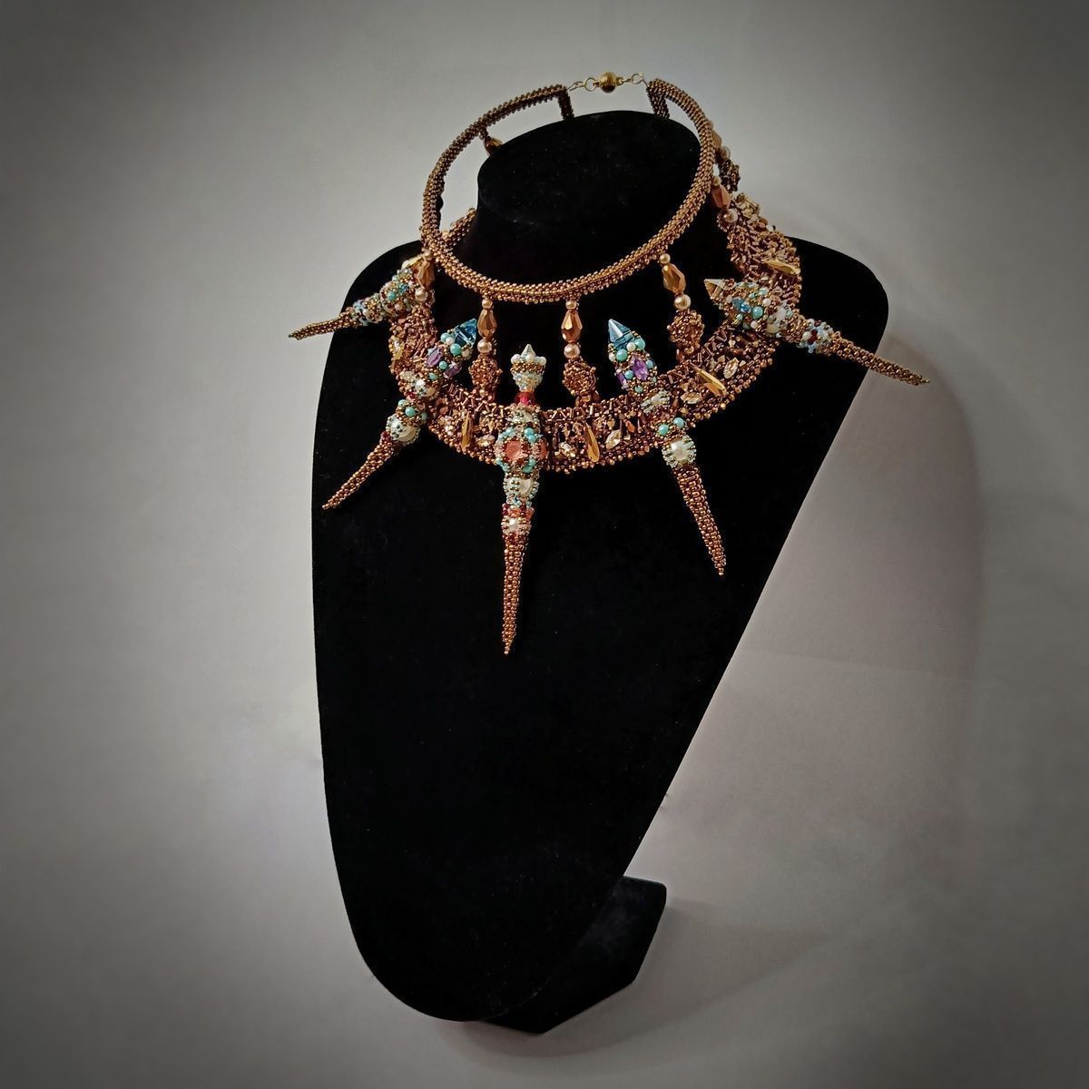 Моя работа посвящена старинному традиционному способу рукоделия-прядению, круглая форма колье со стойками, соединяющими большой круг и малый, символизируют колесо прялки, на котором закреплены разноцветные веретëна. При создании этого колье, я вдохновилась старинными веретенами, найденными в деревне при разборе дома, принадлежащего многие года нашей семье. Разноцветные, красивые, резные, длинные и короткие, на некоторых ещё была сохранена намотанная шерстяная нить. Когда берёшь в руки эти предметы старины, сразу представляешь как твои прабабушки сидели у окна, пряли, пели песни, отдыхая от тяжёлого деревенского быта.