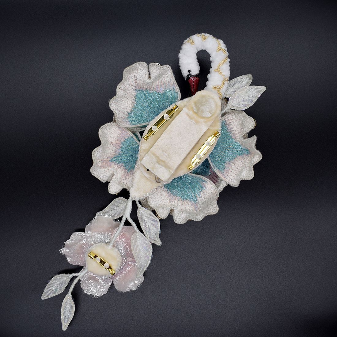Она воплощение женственности и изящества, очаровательная и нежная, словно лебедь. Её образ завершён восхитительным украшением на поясе платья, чуть ниже талии— брошь представленная в форме флорального антропоморфа. Изящная шея элегантного лебедя плавно перетекает в тело фантастического цветка, создавая гармонию двух миров. В центре величественный кристалл Swarovski, создающий игру граней и украшающий сердечную точку сказочного цветка, усыпанного искрящимися стразами. В завершении нежная ветвь с бутоном и листьями, вышитыми аккуратными рядами белого жемчуга Swarovski, усиливающего ощущение нежности и женственности образа