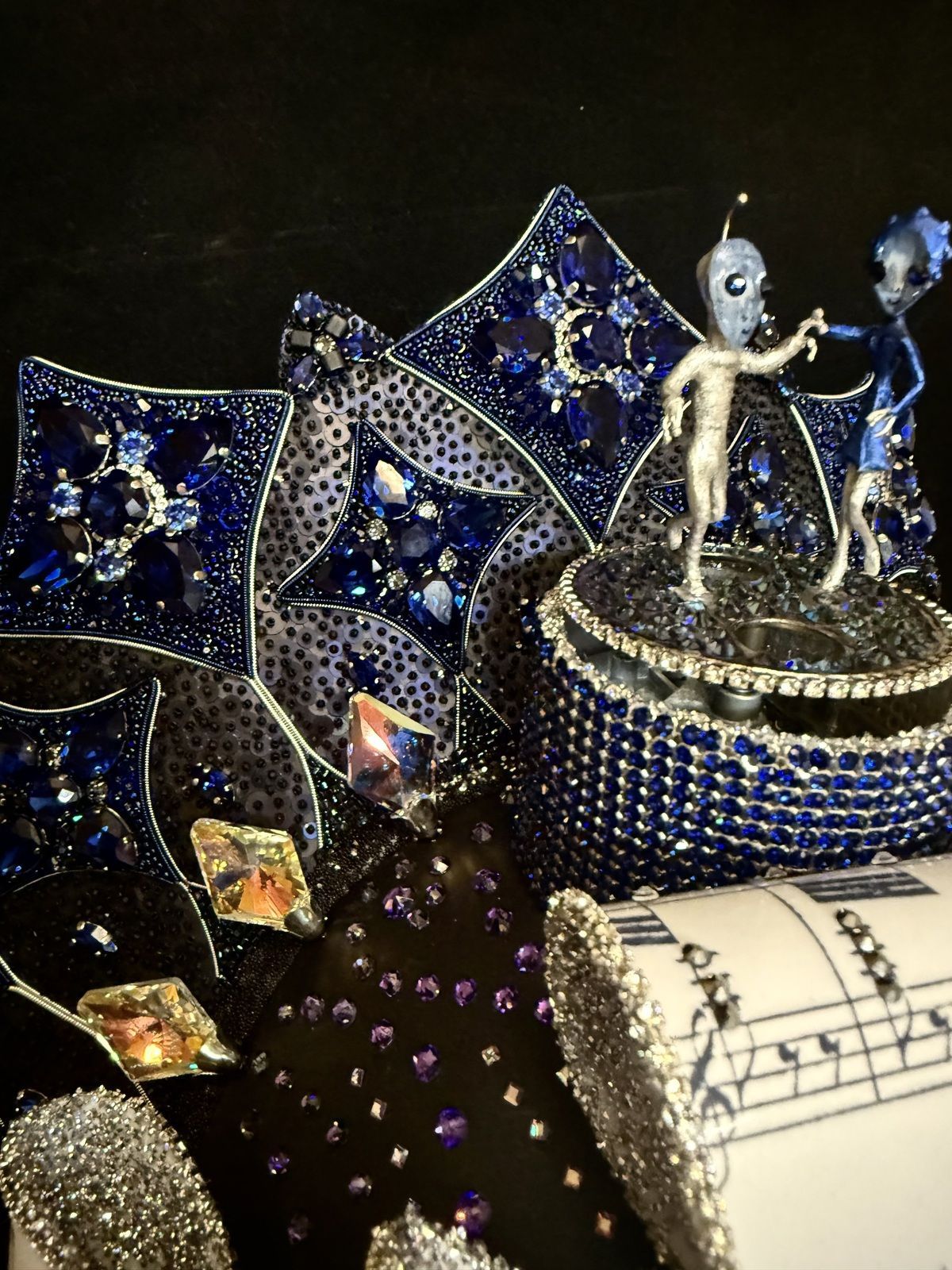 В маске использован музыкальный механизм, при заводе проигрывается фрагмент вальса «На прекрасном голубом Дунае», а фигурки инопланетян вращаются.