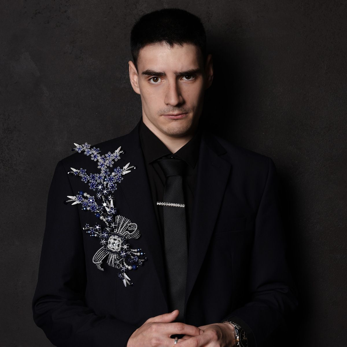 В её сердце — ажурный элемент с бантом и лентами, созданный из мельчайших бусин циркона и сумеречного стекла. Это архитектурный центр всей композиции. Он напоминает нам о классической строгости образа и о творческой свободе художника. Это узел, связующий все мотивы воедино.