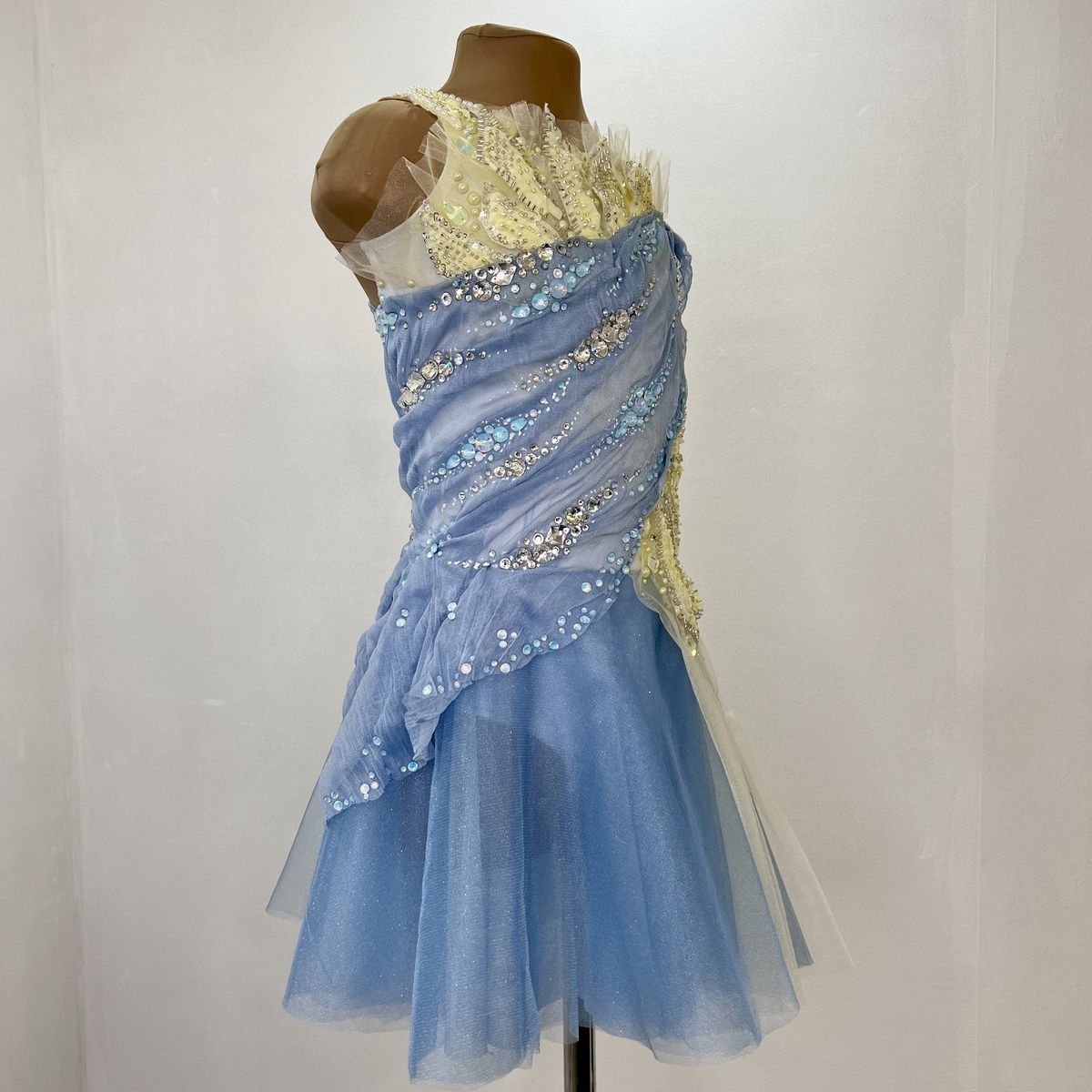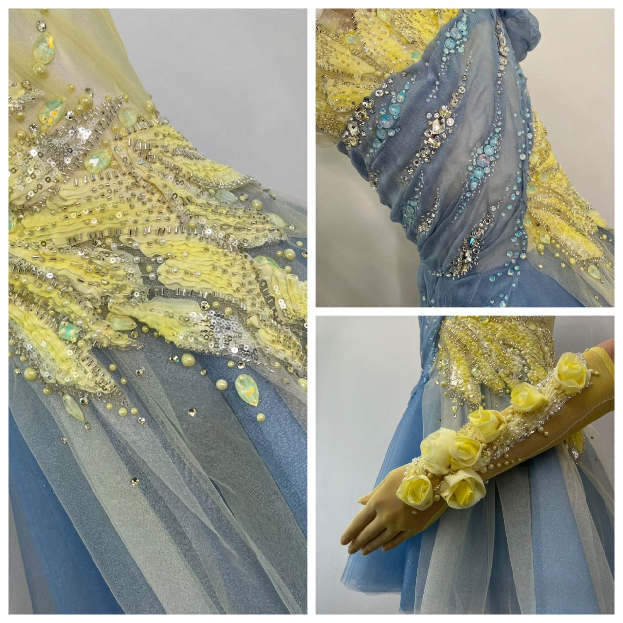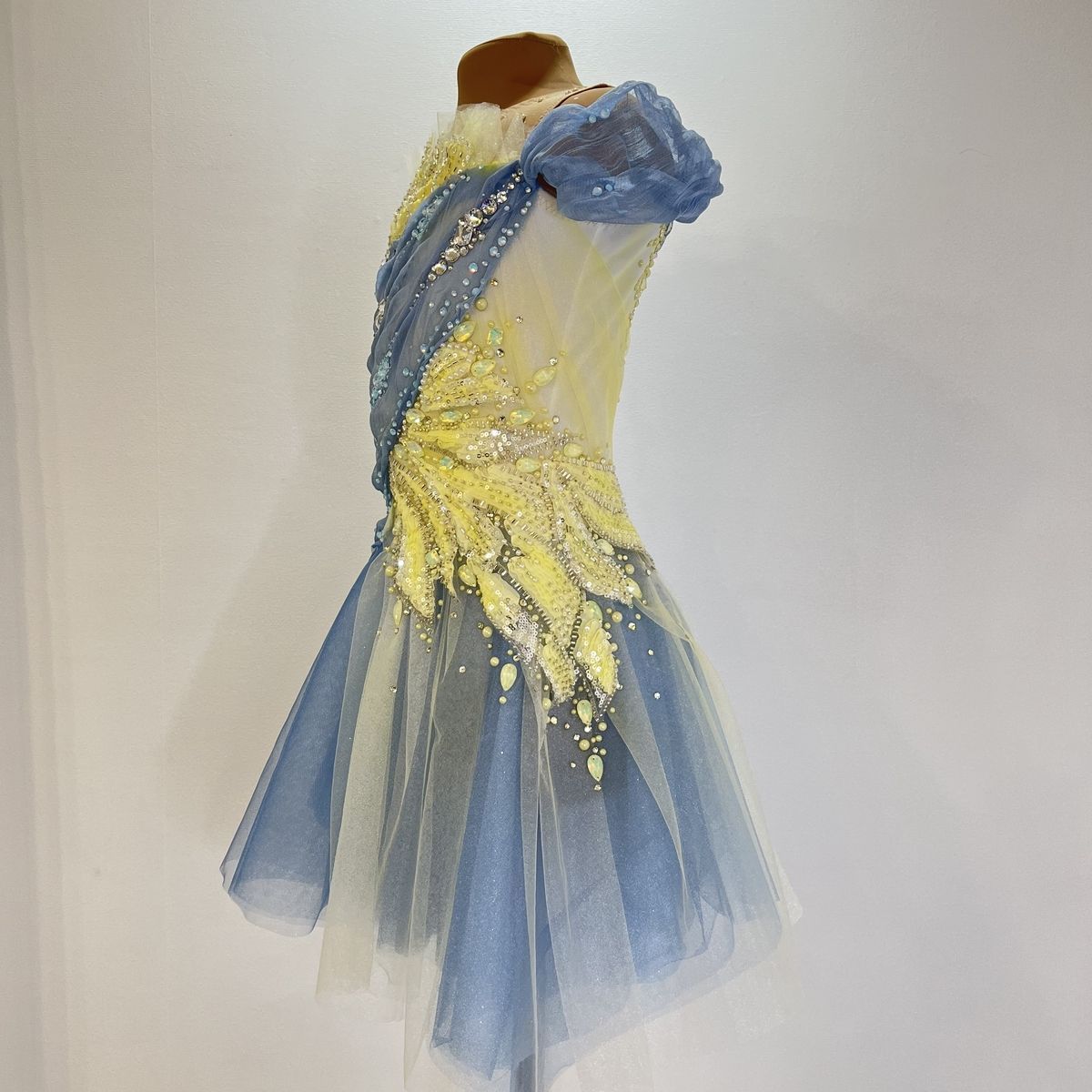 Платье в пастельных тонах, с букетом жёлтых роз, рассказывает о любви и нежности. Драпировка из голубой жатой сетки, как символ бушующих вод, омывающих Петербург, говорит о печальном расставании влюблённых.