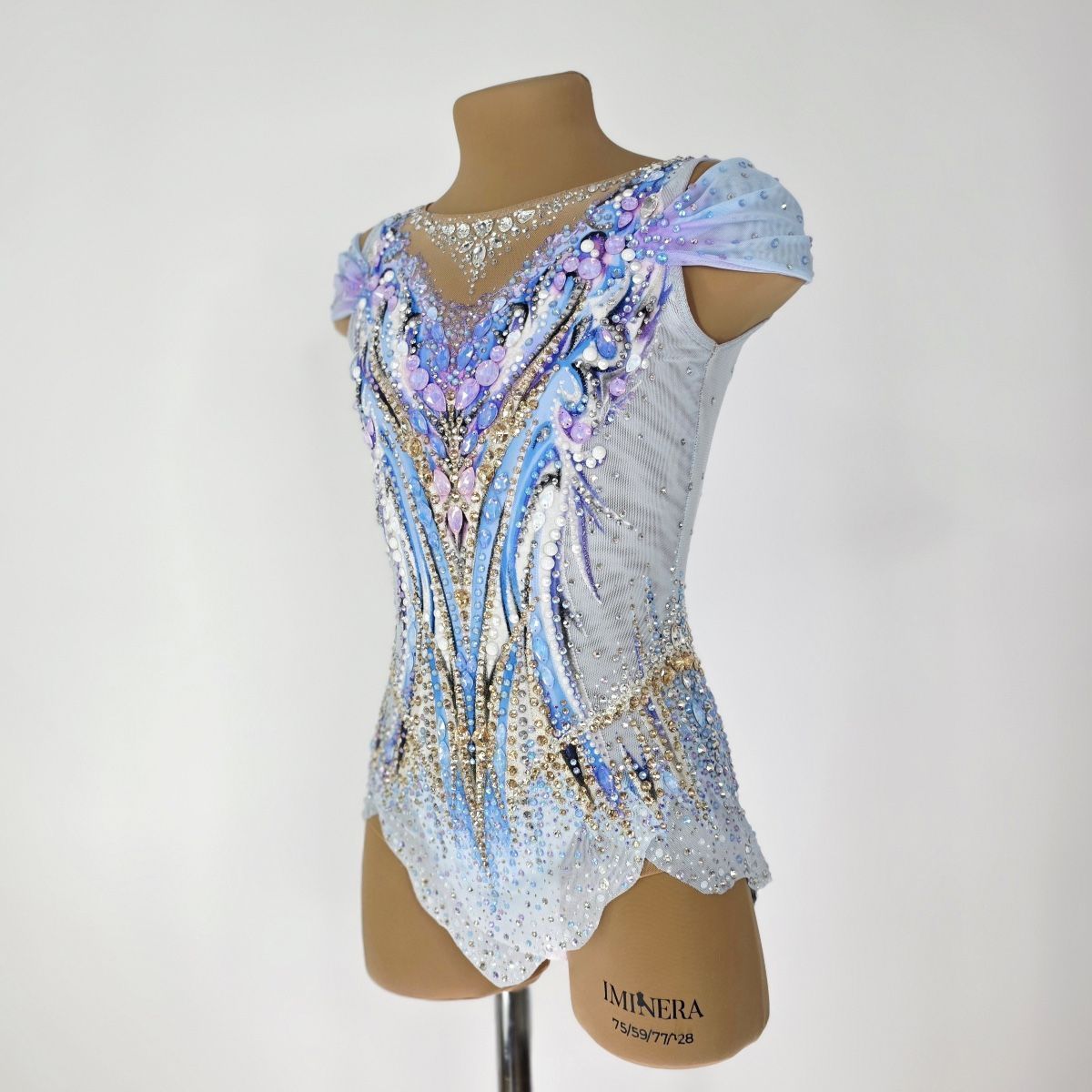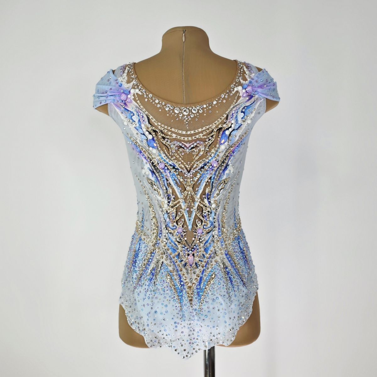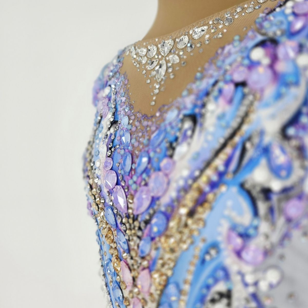 И в этот момент появилась она — лёгкая, словно дыхание, и сияющая, как утренний лёд в лучах солнца. Переливы голубого и сиреневого на её наряде напоминают хрустальные витражи, а каждая искра камней отражает музыку вечности.