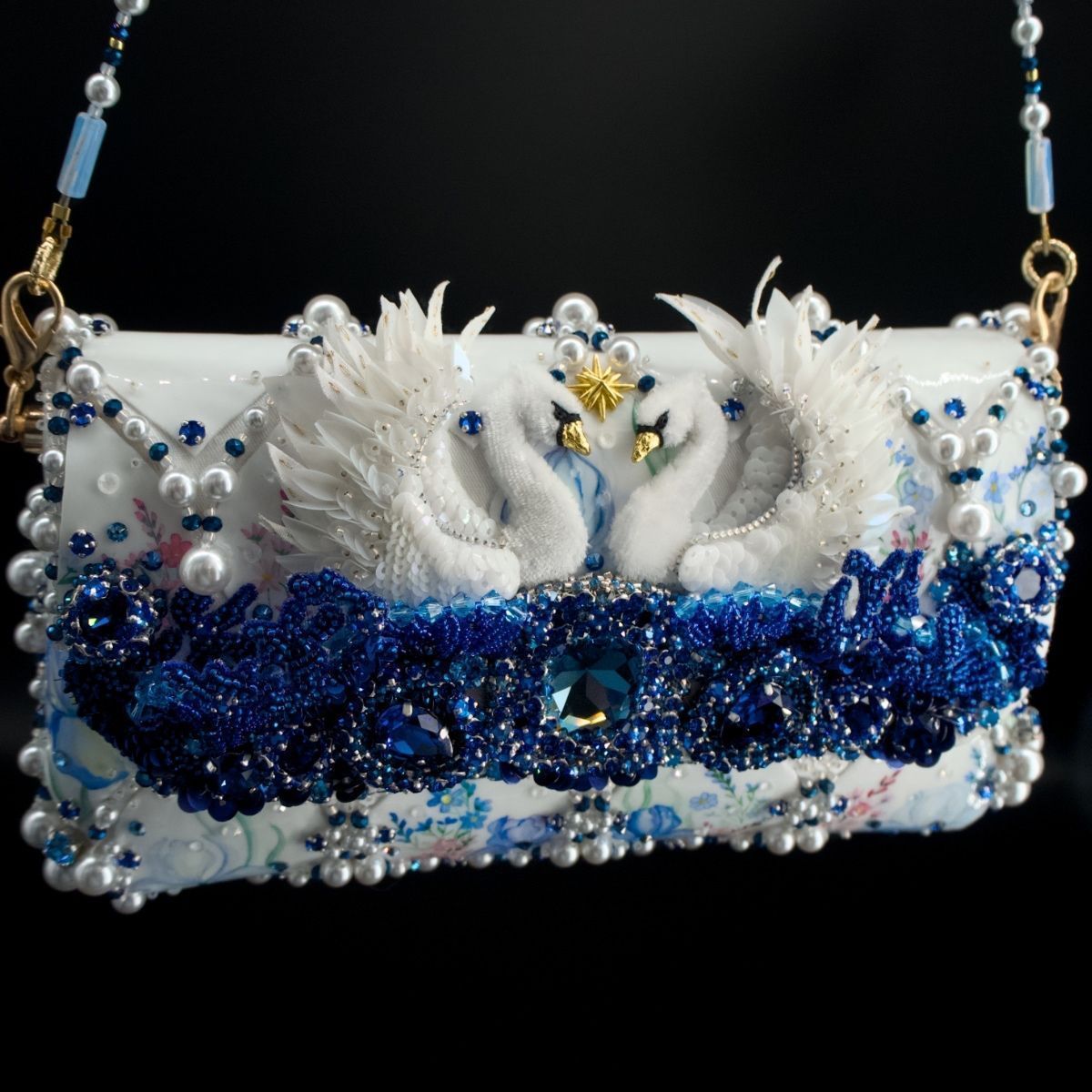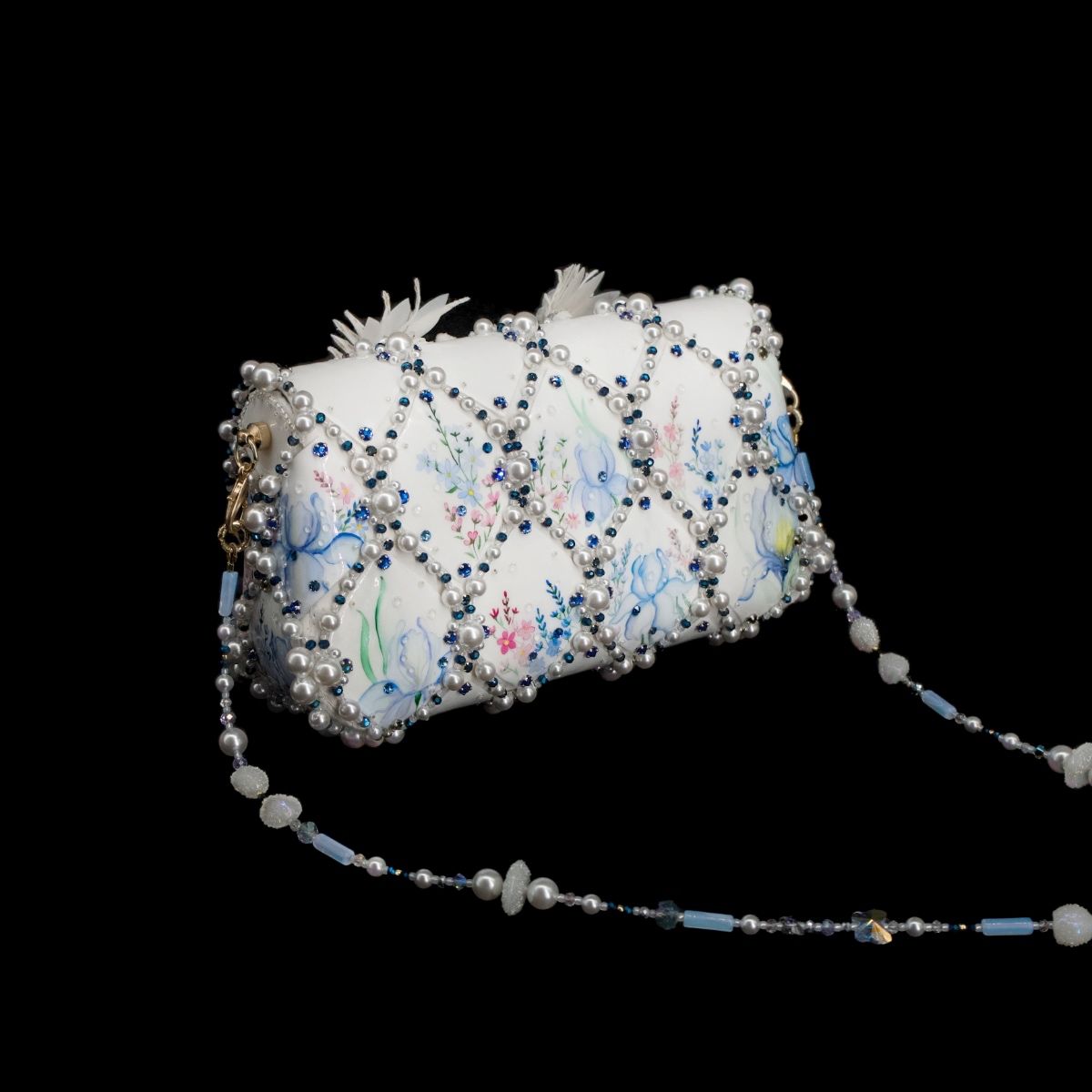 В представленной сумочке этот сюжет обрел свой символичный, счастливый финал, найдя свое отражение в мерцании хрусталя и жемчуга, в бликах расписного «фарфора», как напоминание о хрупкости, казалось бы, незыблемых идеалов и традиций.