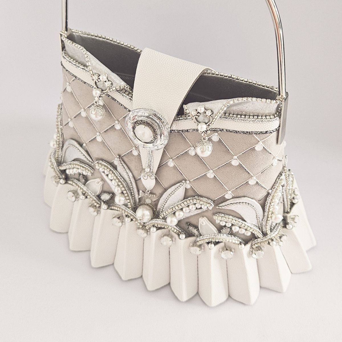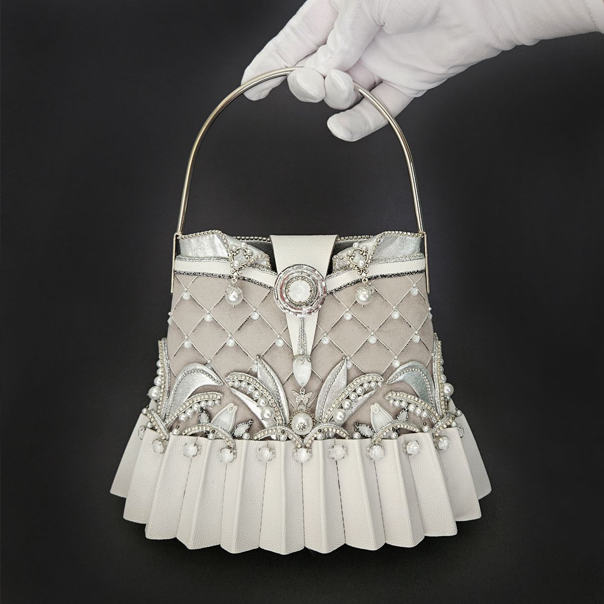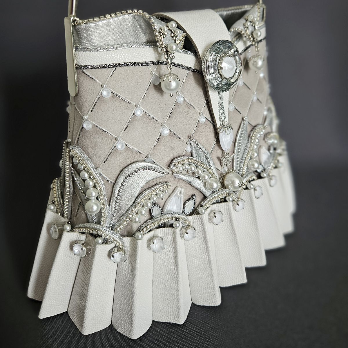 При создании сумки я попыталась соединить два мира: мир традиций, где царят вальс и этикет, и мир будущего, где правят чистые линии и технологии. За классику отвечают: жемчуг, превратившийся в нежные ландыши, общий цветочный мотив и имитация каретной стяжки. Футуристическим контрастом выступают элементы, лишенные декора: строгое геометричное плиссированное основание и лаконичная ручка простой формы.