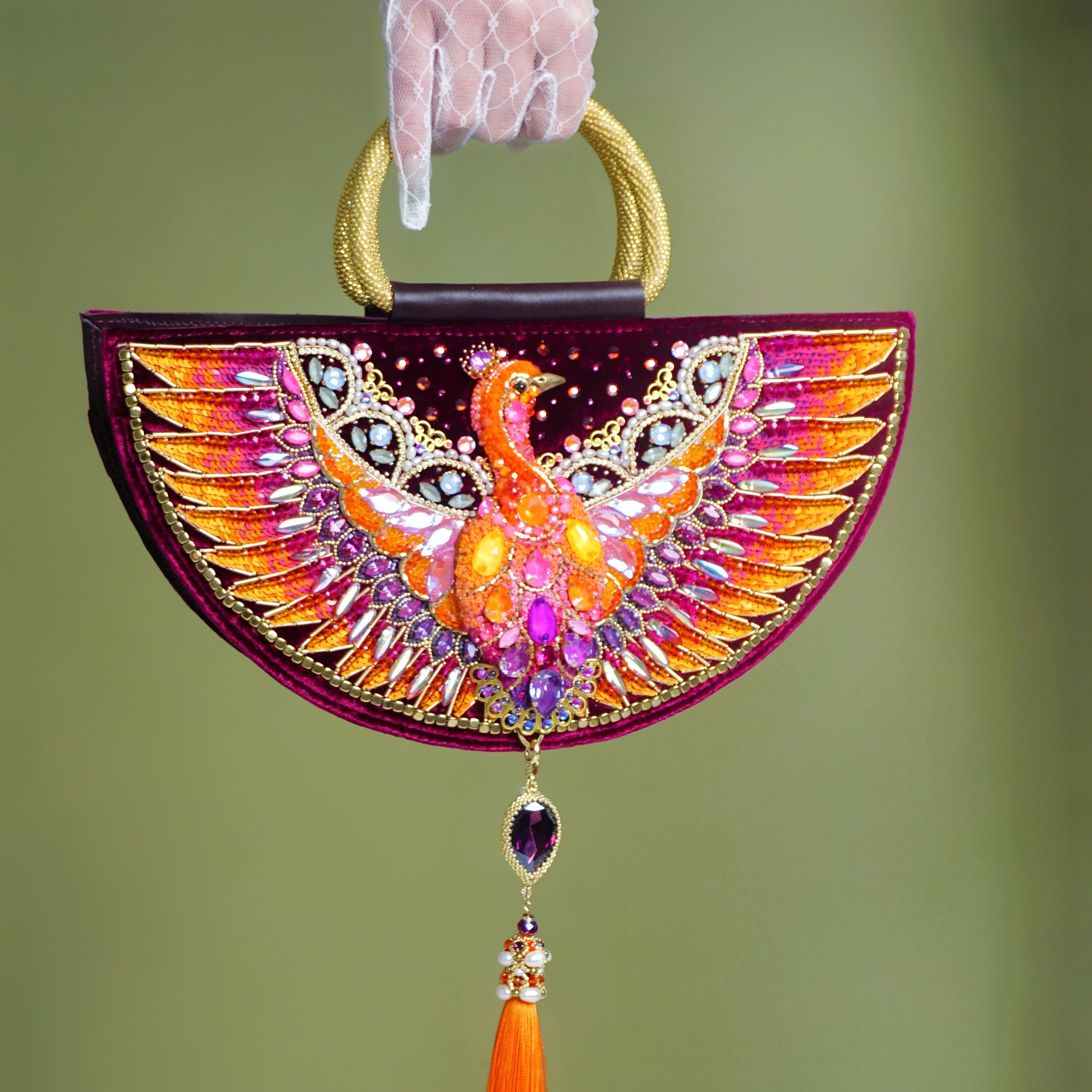 Сумка «Веер перемен» создана на каркасной основе в стилизованной форме веера, но в современном стиле. Ручки сумки обвязаны жгутами из золотого бисера, что несет в себе не только практичное применение, но и также декоративный характер-стилизацию солнца, к которому тянется птица. Также у сумки есть дополнительные снимающиеся аксессуары: длинная ручка-трансформер, состоящая из латунной цепочки, жемчуга и бусин, а также обвес, который также является продолжением хвоста птицы.
