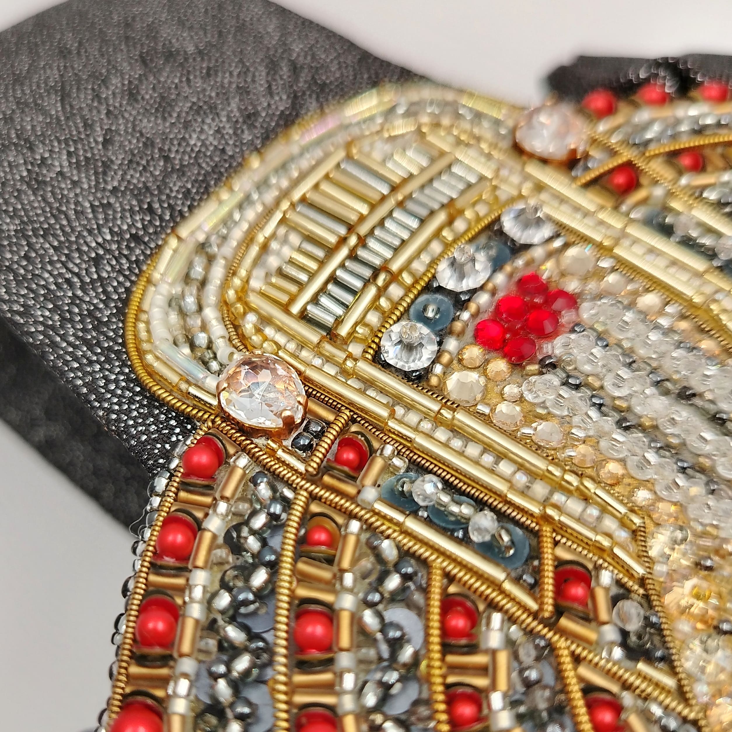 Элементы ручной вышивки имитируют колонны, люстры, букеты цветов и даже участников.